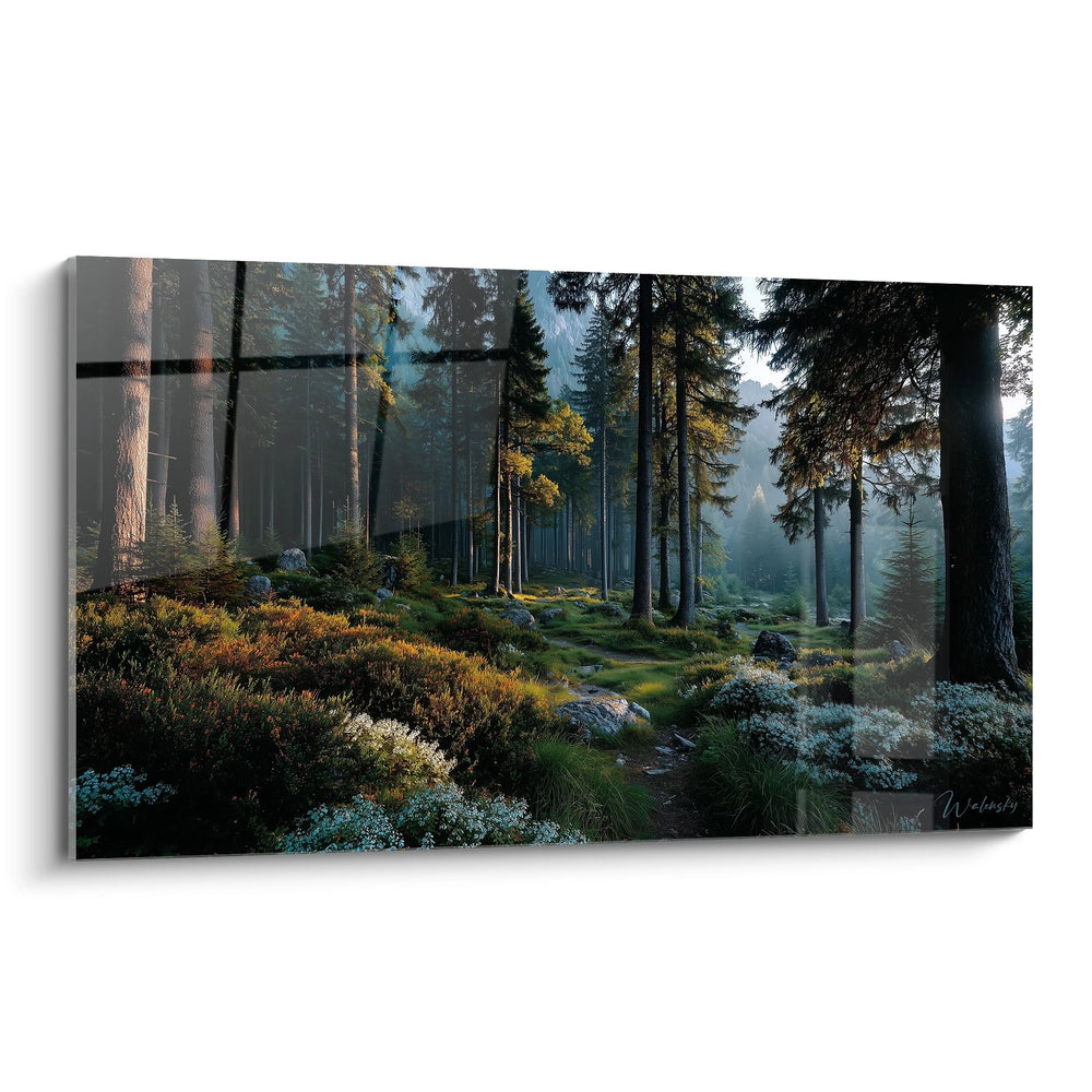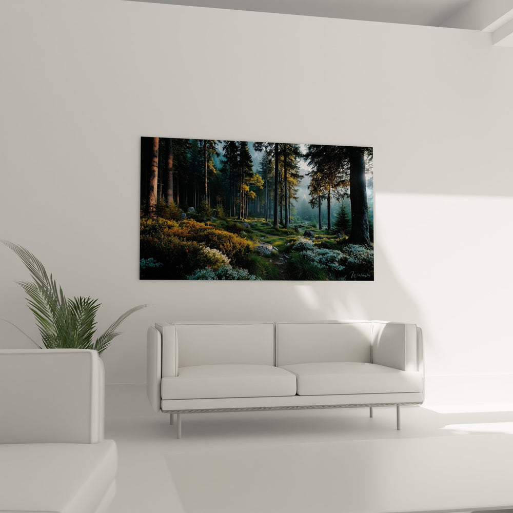 Ce magnifique tableau mural forêt capture la beauté envoûtante d'une forêt de conifères baignée dans une lumière dorée matinale. L'œuvre dépeint un paysage forestier d'une sérénité absolue, où de majestueux épicéas et sapins s'élèvent vers un ciel teinté de bleu matinal. Au premier plan, un tapis végétal coloré composé de mousses, lichens et petites plantes sauvages forme un écrin naturel aux teintes automnales. Les rayons de soleil percent délicatement à travers la canopée, créant un jeu d'ombres et de lumières qui confère à cette décoration murale nature une atmosphère mystérieuse et contemplative. Le sentier serpentant invite à la méditation et à l'évasion. Cette œuvre d'art forestière révèle dans ses moindres détails la richesse d'un écosystème préservé, des rochers moussus aux branches délicatement éclairées. La composition équilibrée entre les zones d'ombre et de lumière transforme ce tableau décoratif paysage en une véritable fenêtre ouverte sur la nature sauvage, apportant calme et sérénité à tout espace de vie.