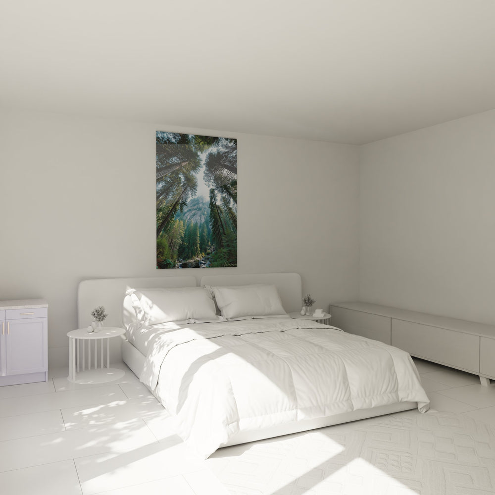 Tags : tableau forêt conifères, décoration nature montagne, perspective verticale, art mural paysage, ambiance forestière