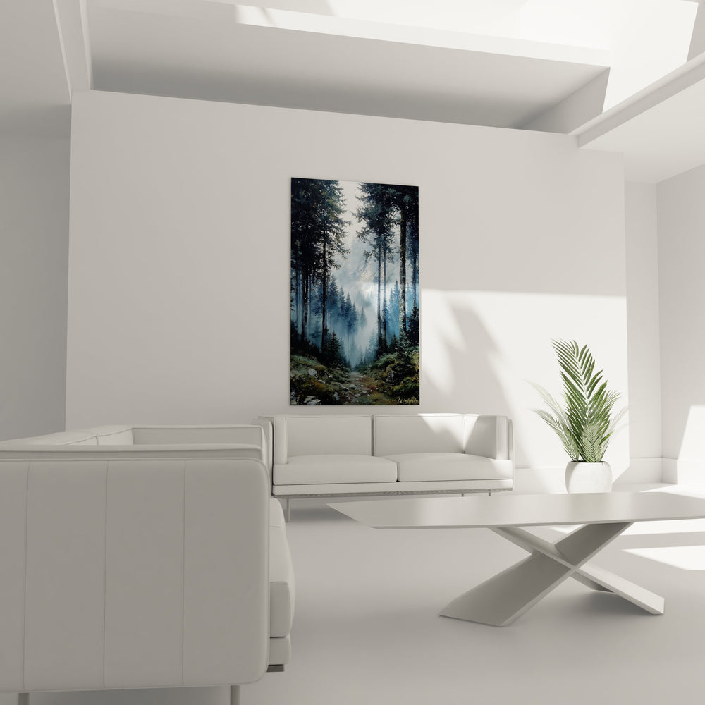 Ce tableau mural forêt capture la majesté d'une forêt de conifères enveloppée dans une atmosphère mystérieuse et contemplative. L'œuvre dépeint un chemin forestier sinueux serpentant entre de hauts sapins élancés, leurs silhouettes sombres se dressant comme des gardiens silencieux. Les rayons de soleil filtrant à travers la canopée créent un jeu de lumière spectaculaire, illuminant délicatement la brume matinale qui flotte entre les arbres. Au premier plan, le sol forestier est parsemé de rochers moussus et de fougères, témoins de la richesse de cet écosystème préservé. Ce tableau nature apaisante transporte le spectateur dans une promenade méditative au cœur d'une forêt brumeuse enchantée. La perspective profonde de la composition invite à suivre ce sentier mystérieux qui se perd dans les profondeurs boisées. L'artiste a su capturer cette ambiance forestière matinale où la nature révèle toute sa splendeur sauvage et préservée, créant une œuvre d'art qui évoque la sérénité et l'émerveillement face à la beauté naturelle.