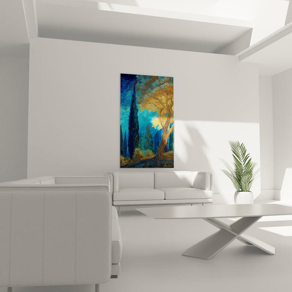 Ce magnifique tableau mural forêt mystérieuse présente un bosquet enchanteur baigné dans une lumière dorée exceptionnelle. La composition révèle un arbre majestueux au premier plan, dont le tronc sinueux s'élance vers un feuillage d'or chatoyant qui contraste sublimement avec le ciel bleu turquoise en arrière-plan. Cette œuvre d'art nature capture l'essence même de la sérénité forestière à travers des coups de pinceau tourbillonnants qui rappellent les maîtres impressionnistes. Les arbres stylisés créent une profondeur remarquable, invitant le regard à se perdre dans cette forêt impressionniste où chaque détail révèle la beauté sauvage de la nature. Le jeu de lumières et d'ombres transforme ce simple bosquet en véritable sanctuaire visuel, où les tons chauds du feuillage automnal se mêlent harmonieusement aux nuances froides du ciel. Cette peinture paysage artistique transcende la simple représentation pour devenir une invitation à la contemplation et à l'évasion dans un monde naturel idéalisé.