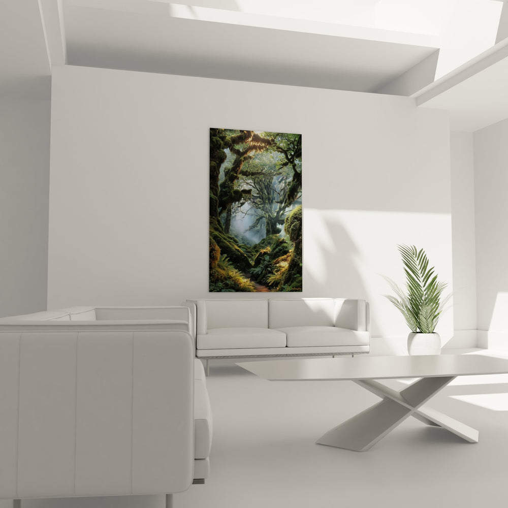 Ce tableau mural forêt mystique capture l'essence d'un sanctuaire naturel baigné dans une atmosphère féerique. La composition révèle un paysage forestier brumeux où d'anciens arbres aux troncs noueux se dressent majestueusement, leurs branches tortueuses créant une canopée naturelle filtrante. La mousse verdoyante recouvre généreusement les écorces, témoignant de l'humidité perpétuelle de ce lieu préservé. Au cœur de cette forêt enchantée, la brume matinale s'élève doucement du sol, créant des voiles vaporeux qui dansent entre les fûts centenaires. Les fougères luxuriantes tapissent le sol forestier, formant un tapis végétal d'un vert profond et apaisant. La lumière dorée perce subtilement à travers cette cathédrale naturelle, illuminant délicatement certaines zones et créant un jeu d'ombres et de clarté. Ce tableau nature zen évoque un monde parallèle où le temps semble suspendu, invitant à la méditation et à l'évasion. L'artiste a magistralement rendu la texture rugueuse des écorces anciennes contrastant avec la douceur veloutée de la mousse. Cette œuvre d'art forestière transforme instantanément l'ambiance d'un intérieur, apportant la sérénité d'une forêt primaire mystérieuse dans votre espace de vie.