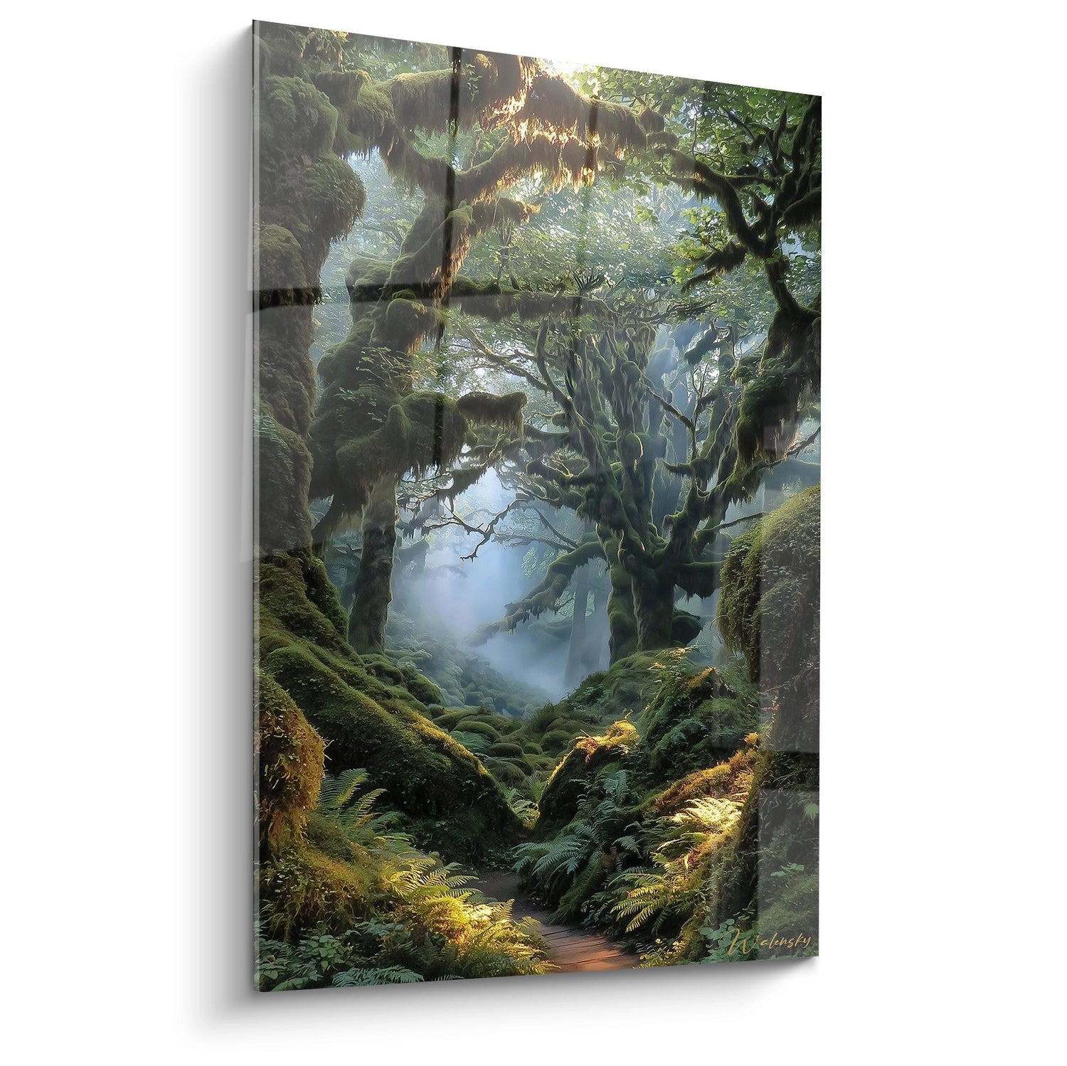 La palette chromatique naturelle de cette œuvre puise dans les tons terreux et végétaux pour créer une harmonie visuelle parfaite. Les verts profonds de la mousse et des fougères symbolisent la régénération et la croissance spirituelle, tandis que les bruns chaleureux des troncs évoquent la stabilité et l'ancrage. La brume bleutée représente le mystère et la transcendance, invitant à l'introspection. Cette décoration murale zen incarne la connexion primitive entre l'homme et la nature.