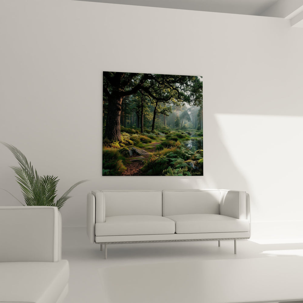 Ce tableau mural forêt capture la magie d'un sentier forestier brumeux serpentant à travers une végétation luxuriante. L'œuvre dépeint avec finesse un paysage naturel mystique où la lumière filtrée crée une atmosphère contemplative unique. Les arbres majestueux aux troncs élancés s'élèvent vers un ciel voilé de brume, tandis qu'un petit cours d'eau traverse délicatement la composition. La mousse verdoyante recouvre les rochers et le sol forestier, ajoutant une texture riche à cette scène de nature sauvage. Les fougères et la végétation basse créent un tapis naturel d'un vert profond, ponctuées de touches dorées qui évoquent la lumière matinale. Ce tableau décoratif nature transporte l'observateur dans un univers paisible où règne la sérénité des forêts enchantées. Chaque détail, des écorces texturées aux reflets dans l'eau, contribue à créer une œuvre d'une beauté saisissante qui transformera votre espace en véritable havre de paix naturel.
