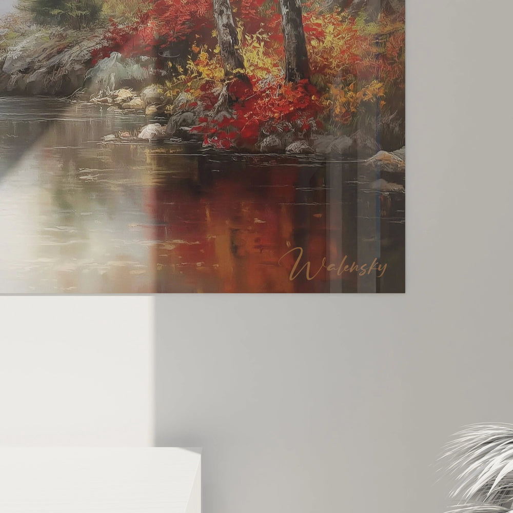 Plusieurs éléments distinctifs confèrent à cette œuvre son caractère unique et reconnaissable. La présence simultanée de la brume atmosphérique et des reflets cristallins dans l'eau crée un jeu visuel fascinant entre opacité et transparence. Les bouleaux aux troncs caractéristiques servent de piliers naturels encadrant parfaitement la composition centrale. L'équilibre entre les tons chauds flamboyants et les nuances froides brumeuses génère une tension visuelle captivante. Cette décoration murale automne unique se distingue par sa capacité à évoquer simultanément la tranquillité et l'émerveillement. La signature artistique visible témoigne de l'authenticité de l'œuvre, tandis que la qualité du rendu lumineux confère une dimension presque photographique à certains détails, particulièrement visible dans les reflets aquatiques.