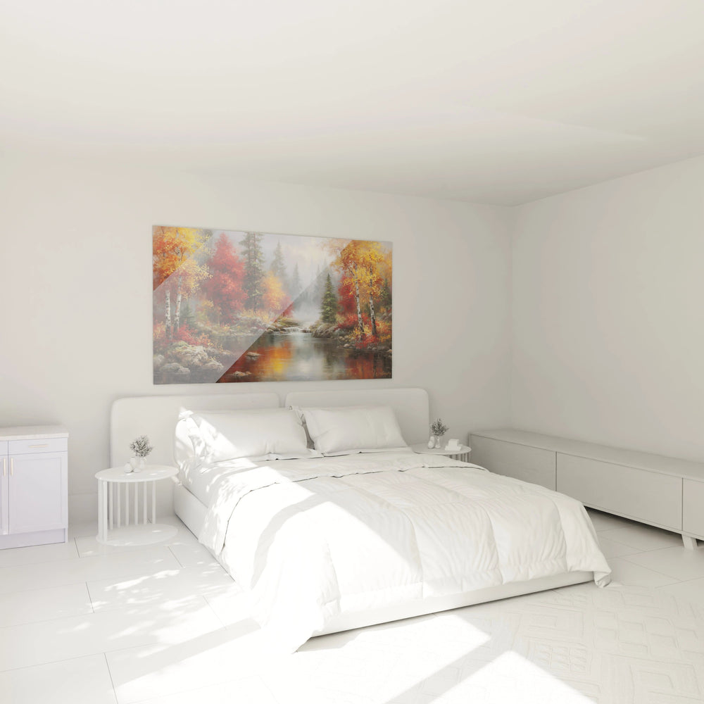 La palette chromatique de cette œuvre révèle une maîtrise exceptionnelle des tons automnaux chauds. Les couleurs dominantes oscillent entre des jaunes dorés éclatants, des rouges carmin profonds et des oranges cuivrés qui embrasent littéralement la canopée. Cette art mural forêt colorée présente des contrastes saisissants entre les tons chauds du feuillage et les teintes froides et neutres de la brume et de l'eau.