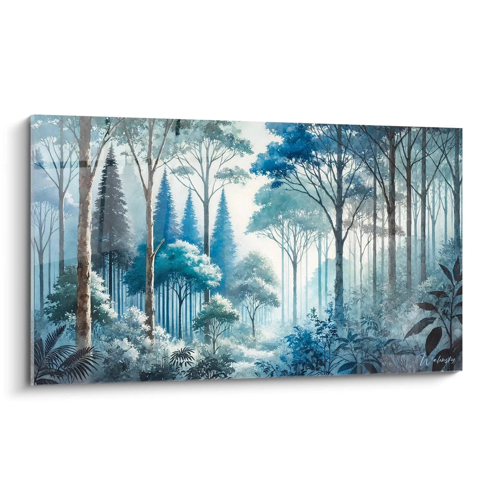 Les teintes choisies oscillent entre des verts apaisants et des bleus profonds, ponctuées par une lumière diffuse teintée de blanc. Cette palette délicate confère à l’œuvre une aura onirique, invitant au rêve et à la réflexion. Placé stratégiquement, ce tableau devient une source d’inspiration visuelle qui s’harmonise parfaitement avec des matières nobles et des couleurs naturelles.