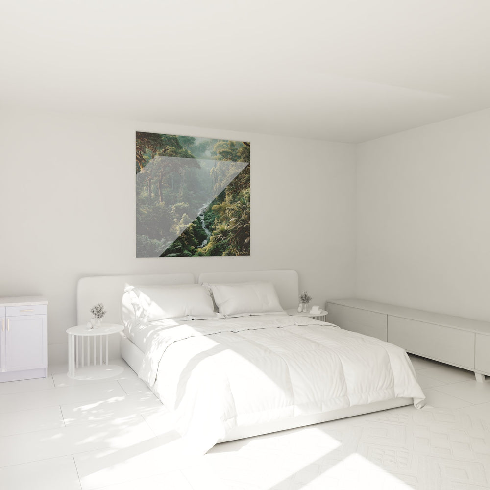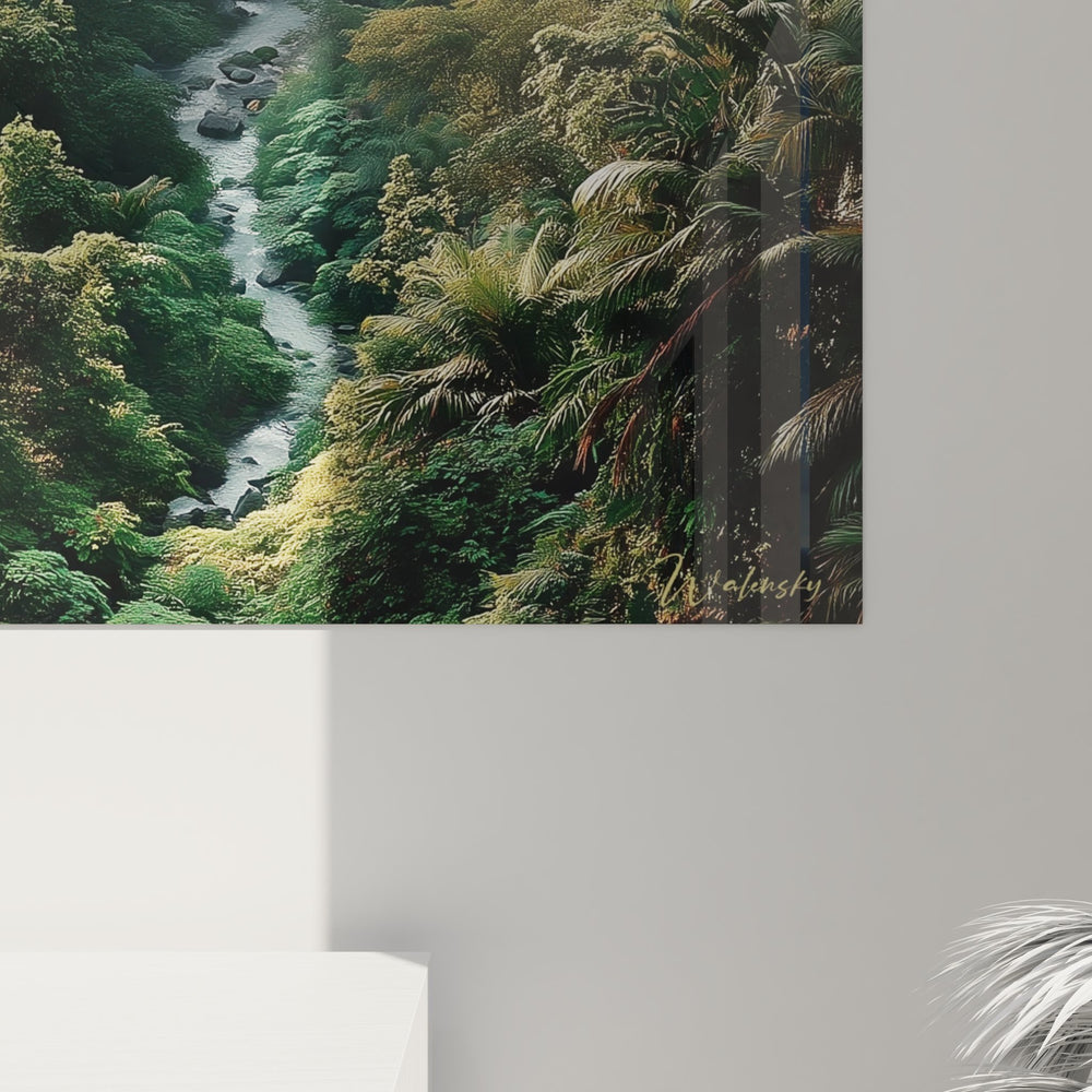 Tags : tableau forêt tropicale, art mural jungle, décoration nature, paysage mystérieux, rivière enchantée