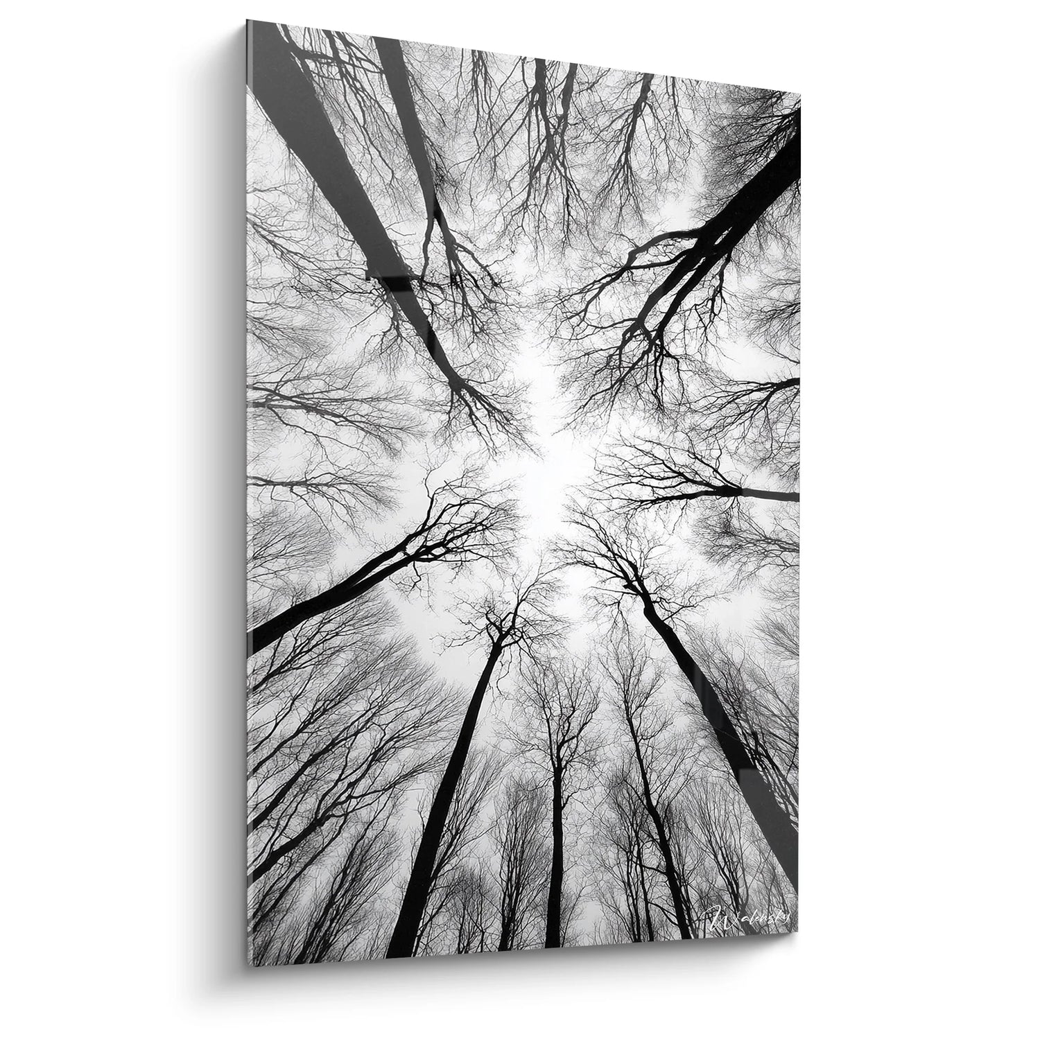 Ce tableau forêt noir et blanc offre une perspective saisissante avec une vue plongée vers le ciel à travers la canopée dénudée. L'image capture magistralement l'entrelacement des branches nues qui s'élancent vers un ciel lumineux, créant un motif naturel hypnotique. Cette photographie artistique de forêt révèle la beauté brute des arbres en hiver, leurs silhouettes élégantes se détachant contre un fond céleste éclatant. Le tableau paysage noir et blanc transforme cette scène forestière en une œuvre d'art contemporaine où chaque branche dessine des lignes organiques fascinantes. La technique photographique employée met en valeur les contrastes saisissants entre les troncs sombres et la luminosité du ciel, offrant une décoration murale nature d'une rare intensité visuelle. Cette toile forêt monochrome invite à la contemplation et apporte une dimension zen à tout intérieur moderne. L'angle de prise de vue, orienté vers le haut, amplifie la sensation de grandeur et d'immensité de la nature, transformant ce tableau XXL paysage en une fenêtre ouverte sur la majesté forestière.