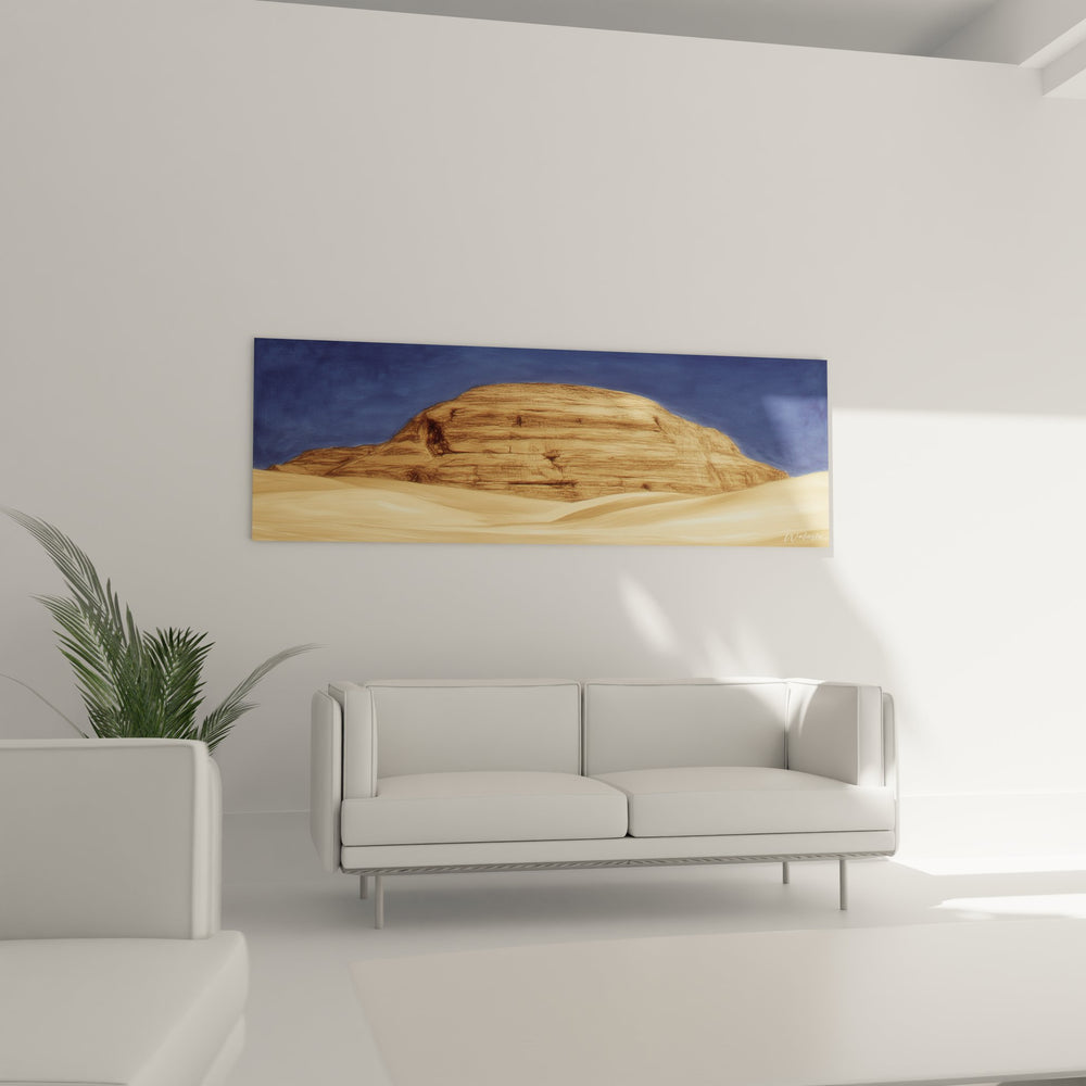 La palette chromatique de ce tableau formation géologique évoque la permanence et la résistance face au temps. Les tons chauds ocre et beige symbolisent la sagesse millénaire, tandis que le bleu profond du ciel représente l'infini et la spiritualité. Cette harmonie colorimétrique désertique crée une atmosphère apaisante et méditative, parfaite pour un intérieur contemporain.