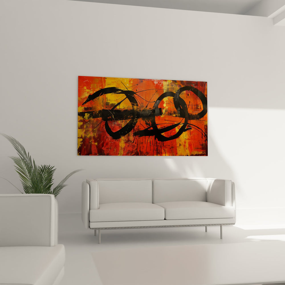La palette chromatique de ce tableau expressionniste orange s'articule autour de tonalités chaudes et énergiques. Les oranges vibrants, les rouges intenses et les jaunes dorés créent une base lumineuse sur laquelle les formes noires prennent toute leur force expressive. Cette opposition chromatique symbolise le contraste entre lumière et obscurité, mouvement et stabilité, créant une atmosphère artistique dynamique particulièrement saisissante.