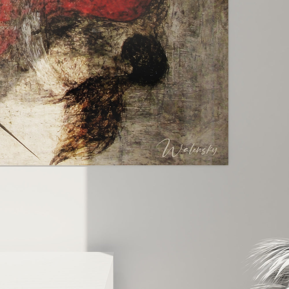 La palette chromatique de ce tableau abstrait aux couleurs vives révèle une harmonie subtile entre les tons chauds et froids. Le rouge passion dialogue avec le bleu profond, tandis que les nuances de beige et de noir créent un équilibre visuel saisissant. Cette décoration murale abstraite moderne évoque le mouvement et l'émotion pure à travers ses contrastes colorés expressifs.