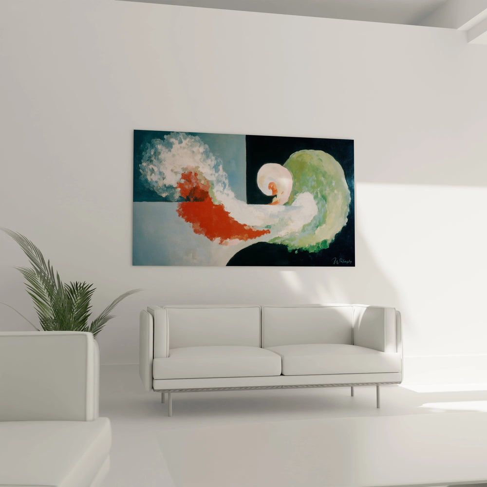 Cette œuvre d'art contemporaine révèle un tableau abstraction colorée aux formes organiques fluides qui défient toute représentation figurative. Les masses colorées semblent danser dans un espace indéfini, créant une composition dynamique où prédominent des tons chauds rouge-orange et des nuances vertes rafraîchissantes. Cette décoration murale abstraction captive immédiatement par son équilibre entre chaos contrôlé et harmonie spontanée. Les formes biomorphes se chevauchent et s'entremêlent, créant un dialogue visuel constant entre les différentes zones chromatiques qui caractérise ce tableau abstraction moderne unique.