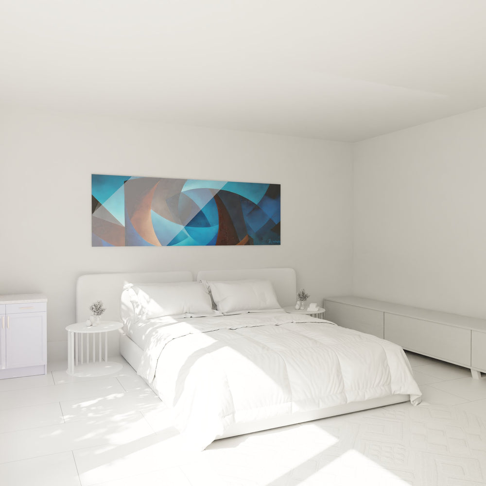 Ce tableau mural géométrique abstrait présente une composition dynamique de formes courbes entrelacées qui évoluent dans un ballet harmonieux de couleurs et de mouvements. L'œuvre se caractérise par des rubans géométriques ondulants qui serpentent à travers la toile, créant un effet de profondeur et de fluidité remarquable. Les courbes abstraites bleues dominent la composition, contrastant élégamment avec des accents d'orange cuivré qui apportent chaleur et dynamisme à l'ensemble. Cette peinture murale moderne joue subtilement avec les jeux d'ombre et de lumière, révélant des nuances subtiles allant du bleu turquoise au bleu marine profond. Les formes géométriques fluides semblent danser dans un espace tridimensionnel, créant une sensation de mouvement perpétuel qui captive le regard. L'artiste a magistralement orchestré cette composition abstraite contemporaine en utilisant des gradients colorés qui donnent une impression de volume et de texture. Chaque courbe semble prolonger la précédente dans une continuité parfaite, formant un ensemble cohérent où aucun élément ne domine les autres. Cette œuvre d'art géométrique moderne transformera instantanément votre espace de vie en lui apportant une touche de sophistication et d'élégance contemporaine.