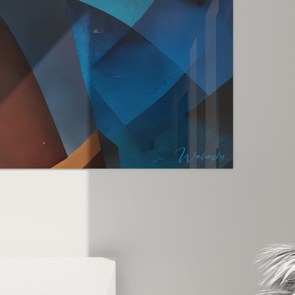 La palette chromatique bleue orange de ce tableau évoque l'harmonie entre la sérénité et l'énergie. Le bleu, couleur de la tranquillité et de la profondeur, dialogue avec l'orange qui symbolise la créativité et la vitalité. Cette symbolique des couleurs géométriques crée un équilibre parfait entre apaisement et dynamisme, idéal pour une décoration murale moderne.