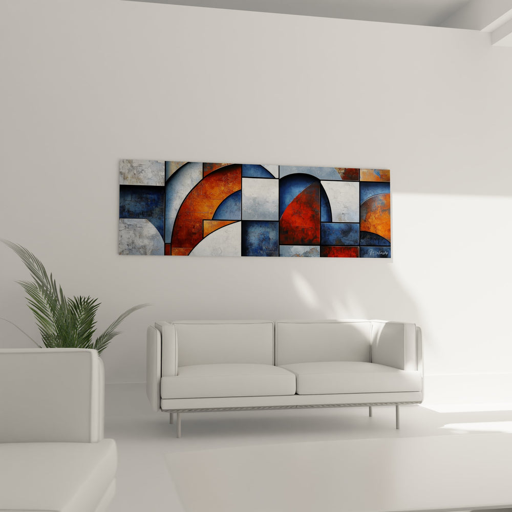 La palette chromatique de ce tableau abstrait géométrique repose sur un triptyque harmonieux : le bleu profond évoquant la sérénité et la profondeur, l'orange cuivré symbolisant l'énergie et la créativité, et le blanc immaculé apportant pureté et équilibre. Cette œuvre géométrique abstraite exprime la recherche d'harmonie entre contraires, où les couleurs chaudes et froides dialoguent dans un équilibre parfait.