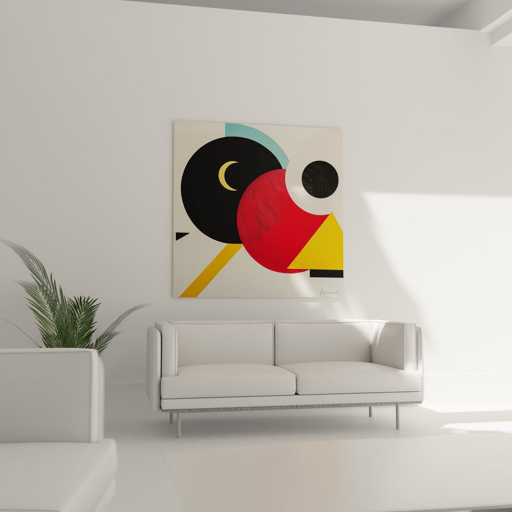 Ce tableau géométrique abstrait présente une composition dynamique de formes colorées sur fond blanc épuré. L'œuvre se caractérise par un assemblage harmonieux de cercles, triangles et rectangles aux couleurs vives et contrastées. Un large cercle jaune doré occupe une position centrale, créant un point focal lumineux qui attire immédiatement le regard. Cette forme circulaire est accompagnée d'un triangle rouge vif qui apporte une énergie directionnelle à la composition. Les formes géométriques colorées sont complétées par des éléments noirs angulaires qui structurent l'espace pictural avec rigueur. Un demi-cercle rouge bordeaux en partie gauche équilibre la composition, tandis que des lignes noires parallèles sur la droite créent un rythme graphique distinctif. Ce tableau mural géométrique s'inspire des principes du constructivisme et du suprématisme, mouvement artistique prônant la pureté des formes. L'artiste a intégré des éléments de décoration murale abstraite à travers des bandes colorées jaune et bleu qui traversent la composition en diagonale. Ces lignes directrices renforcent le dynamisme de l'ensemble tout en créant une profondeur visuelle. L'art géométrique contemporain se révèle ici dans toute sa splendeur, offrant une lecture multiple selon l'angle d'observation. La signature discrète "Walensky" en bas à droite authentifie cette création unique destinée à sublimer les intérieurs modernes.