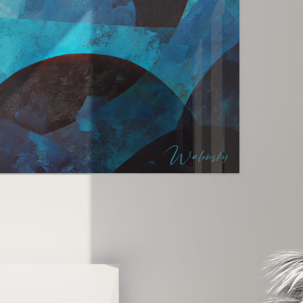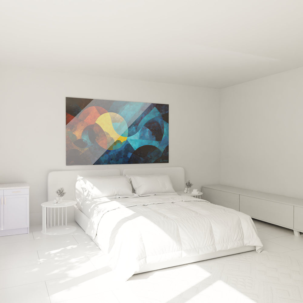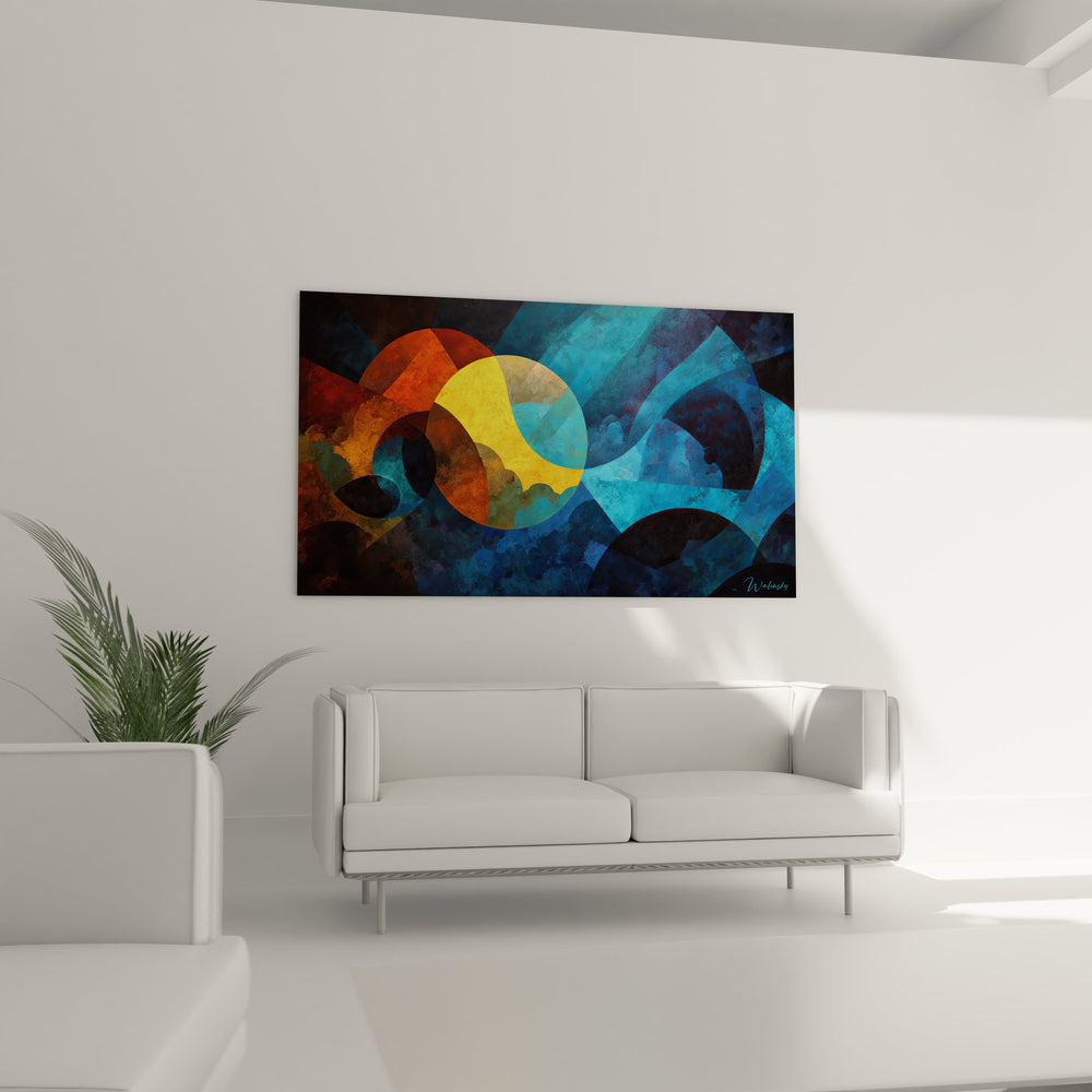 Ce tableau géométrique abstrait présente une composition fascinante de formes circulaires et courbes qui s'entremêlent dans un ballet coloré sophistiqué. L'œuvre dévoile des cercles concentriques et des arcs de cercle qui se superposent harmonieusement, créant un rythme visuel captivant. Les formes géométriques colorées dominent la toile avec une présence majestueuse, passant d'un orange éclatant à un jaune lumineux, puis se fondant dans des nuances de bleu profond et de turquoise. Cette peinture abstraite géométrique révèle une maîtrise parfaite des transitions chromatiques, où chaque forme semble danser avec les autres dans un mouvement perpétuel. Le tableau mural géométrique présente également des éléments linéaires subtils qui structurent l'ensemble, apportant une dimension architecturale à l'œuvre. Les zones d'ombre et de lumière créent une profondeur remarquable, transformant cette décoration murale abstraite en véritable fenêtre vers un univers imaginaire. L'artiste a su créer un équilibre parfait entre dynamisme et sérénité, faisant de ce tableau design moderne une pièce maîtresse pour tout intérieur contemporain.