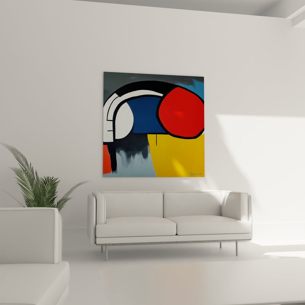 Ce tableau mural géométrique abstrait présente une composition dynamique de formes circulaires et courbes aux couleurs vives. L'œuvre se distingue par son design contemporain minimaliste mettant en scène un cercle rouge vermillon dominant, accompagné d'éléments blancs en forme d'arcs et de segments. La peinture abstraite moderne intègre harmonieusement des zones colorées en jaune ocre, bleu profond et gris nuancé, créant un équilibre visuel saisissant. Les formes géométriques stylisées s'entremêlent avec des contours noirs précis, rappelant l'esthétique du mouvement De Stijl. Cette œuvre d'art murale contemporaine révèle une technique mixte alliant zones nettes et textures brossées, conférant profondeur et mouvement à l'ensemble. Le tableau décoratif géométrique s'impose comme une pièce maîtresse pour tout intérieur moderne, où chaque forme semble danser dans un ballet coloré parfaitement orchestré. La signature discrète de l'artiste Walensky authentifie cette création artistique originale.