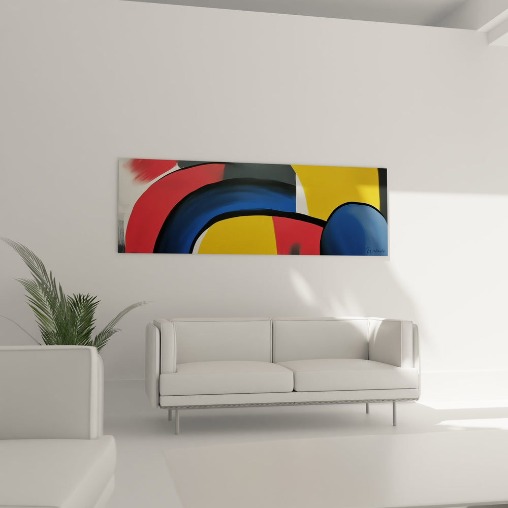 Ce tableau mural géométrique abstrait présente une composition dynamique de formes courbes et circulaires dans une palette de couleurs vibrantes. L'œuvre se caractérise par des formes géométriques harmonieuses qui s'entrelacent avec élégance, créant un mouvement visuel captivant. Les tons rouge corail, bleu profond, jaune doré et blanc cassé se marient parfaitement pour former une symphonie chromatique moderne. Cette peinture abstraite contemporaine joue sur les contrastes et les superpositions, avec des arcs de cercle qui se chevauchent et créent des zones d'ombre et de lumière. Le tableau décoratif moderne révèle une technique raffinée où les couleurs se fondent et se distinguent tour à tour. Les motifs géométriques stylisés évoquent à la fois le mouvement perpétuel et l'harmonie statique, caractéristiques de l'art géométrique contemporain. Cette œuvre d'art murale abstraite transforme l'espace par sa présence imposante et sa composition équilibrée. Les nuances subtiles et les transitions colorées démontrent une maîtrise artistique remarquable, faisant de ce tableau géométrique décoratif une pièce maîtresse pour tout intérieur moderne et sophistiqué.