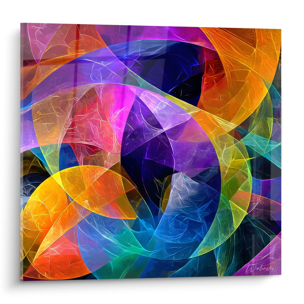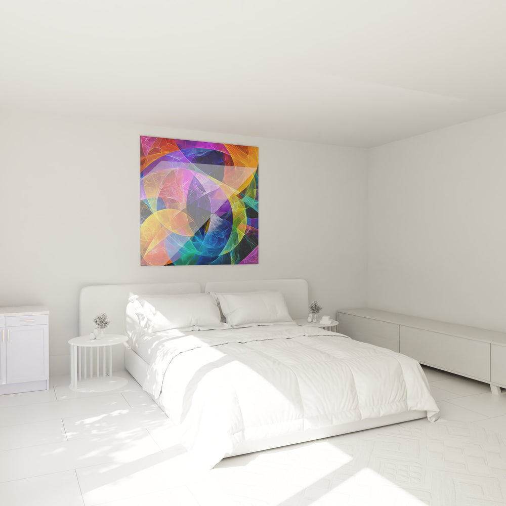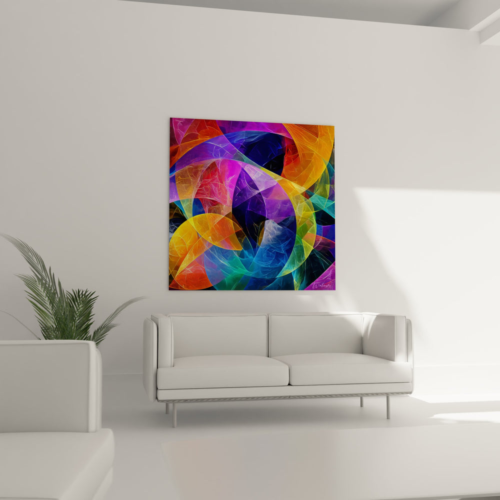 Ce tableau géométrique abstrait présente une composition fascinante de formes entrelacées aux couleurs éclatantes. L'œuvre révèle un art mural moderne où des courbes organiques se mêlent harmonieusement dans un ballet chromatique saisissant. Les teintes oranges, violettes, bleues et vertes s'entrecroisent avec une fluidité remarquable, créant des effets de transparence et de superposition qui captivent le regard. Cette peinture abstraite contemporaine évoque un kaléidoscope géant figé dans le temps, où chaque forme semble danser avec sa voisine. Les lignes courbes délicates qui parcourent la surface ajoutent une dimension tactile à cette décoration murale artistique. L'artiste a magistralement joué avec les contrastes entre les zones sombres et lumineuses, créant une profondeur visuelle exceptionnelle. Ce tableau mural géométrique transforme instantanément n'importe quel espace en galerie d'art contemporain. La technique utilisée révèle une maîtrise parfaite des dégradés et des transitions chromatiques, faisant de cette œuvre un véritable art abstrait géométrique de haute qualité. Chaque regard porté sur cette création révèle de nouveaux détails et de nouvelles interactions entre les formes, garantissant une contemplation toujours renouvelée.
