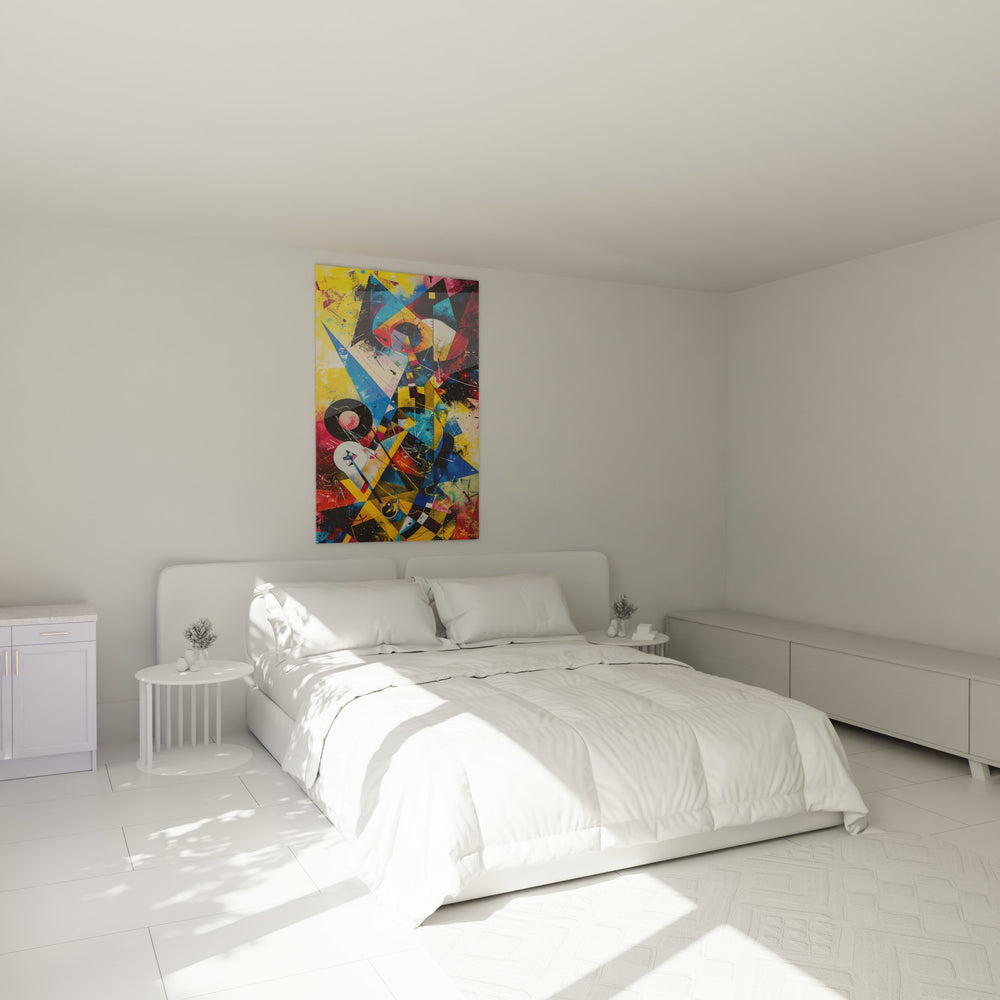 Cette œuvre s'inscrit dans la lignée des maîtres de l'art géométrique abstrait mural comme Kandinsky et Mondrian, tout en adoptant une approche contemporaine. L'influence du constructivisme russe et du mouvement Bauhaus transparaît dans cette toile murale géométrique moderne. Les références au street art et à l'art digital contemporain enrichissent cette création qui dialogue parfaitement avec les codes esthétiques actuels de la décoration d'intérieur design.