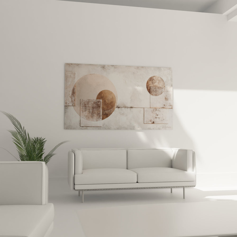 La symbolique des cercles dans cette œuvre évoque l'harmonie, l'unité et la perfection cyclique, tandis que les rectangles apportent structure et stabilité. La palette chromatique dominée par les tons terre, beiges et ocres symbolise la sérénité et l'ancrage, créant une atmosphère apaisante propice à la contemplation et à la méditation.