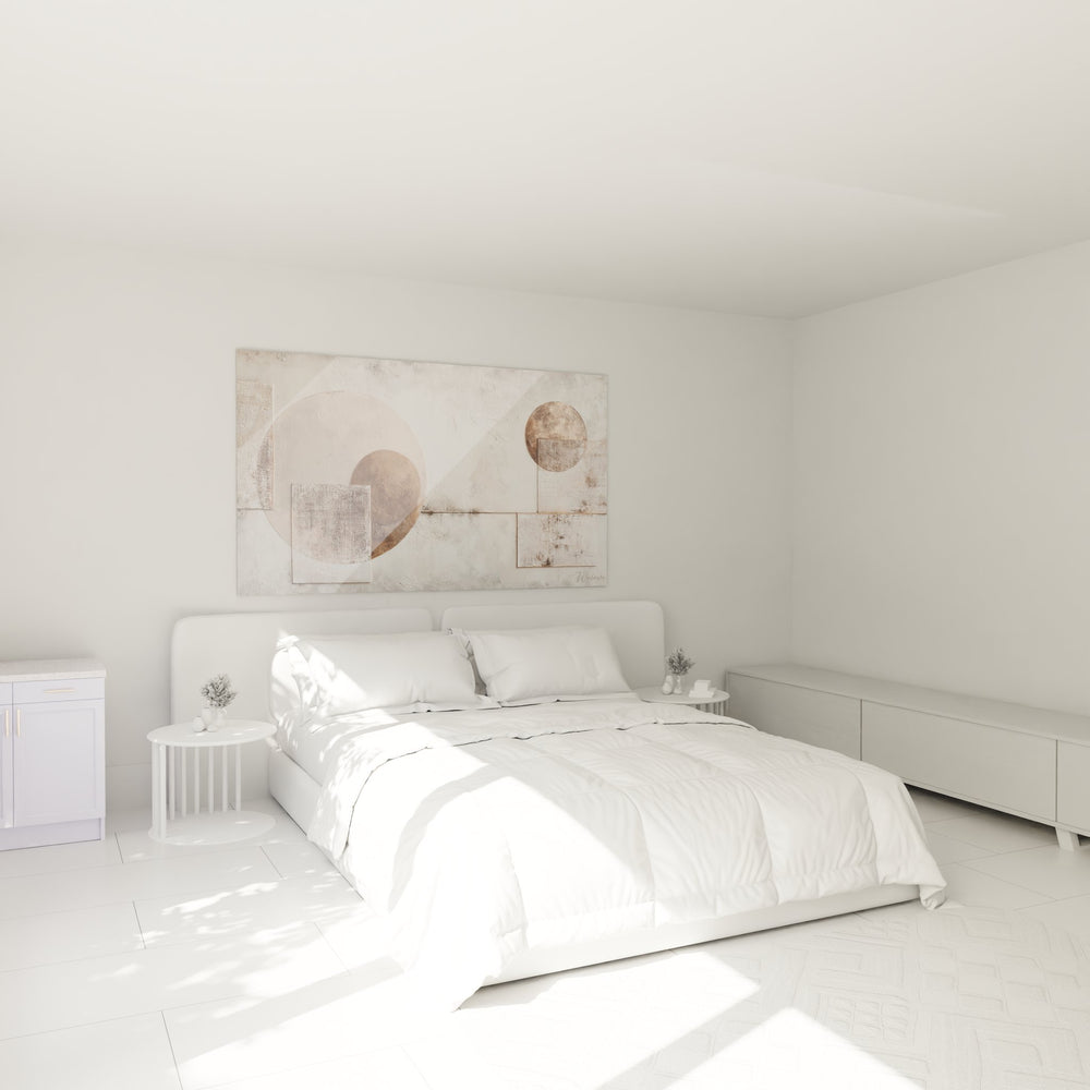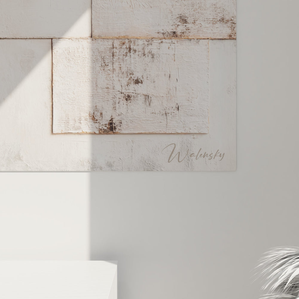 Ce magnifique tableau mural géométrique abstrait présente une composition sophistiquée de formes circulaires et de rectangles dans une palette de tons neutres raffinés. L'œuvre se distingue par l'équilibre parfait entre les cercles abstraits de différentes tailles et les éléments rectangulaires qui créent une dynamique visuelle captivante. Le tableau géométrique moderne exploite les contrastes subtils entre les teintes beiges, ocres et blancs cassés pour générer une profondeur remarquable. Les formes géométriques abstraites semblent flotter sur un fond texturé qui évoque la patine du temps et confère à l'ensemble une dimension tactile unique. Cette œuvre d'art géométrique révèle une maîtrise technique exceptionnelle dans l'agencement des volumes et des espaces négatifs. Les cercles minimalistes s'articulent harmonieusement avec les surfaces rectangulaires, créant un dialogue constant entre courbes et angles droits. L'artiste a su développer une composition abstraite géométrique qui évoque à la fois la modernité et l'intemporel, faisant de ce tableau un élément décoratif polyvalent capable de s'intégrer dans divers environnements contemporains.