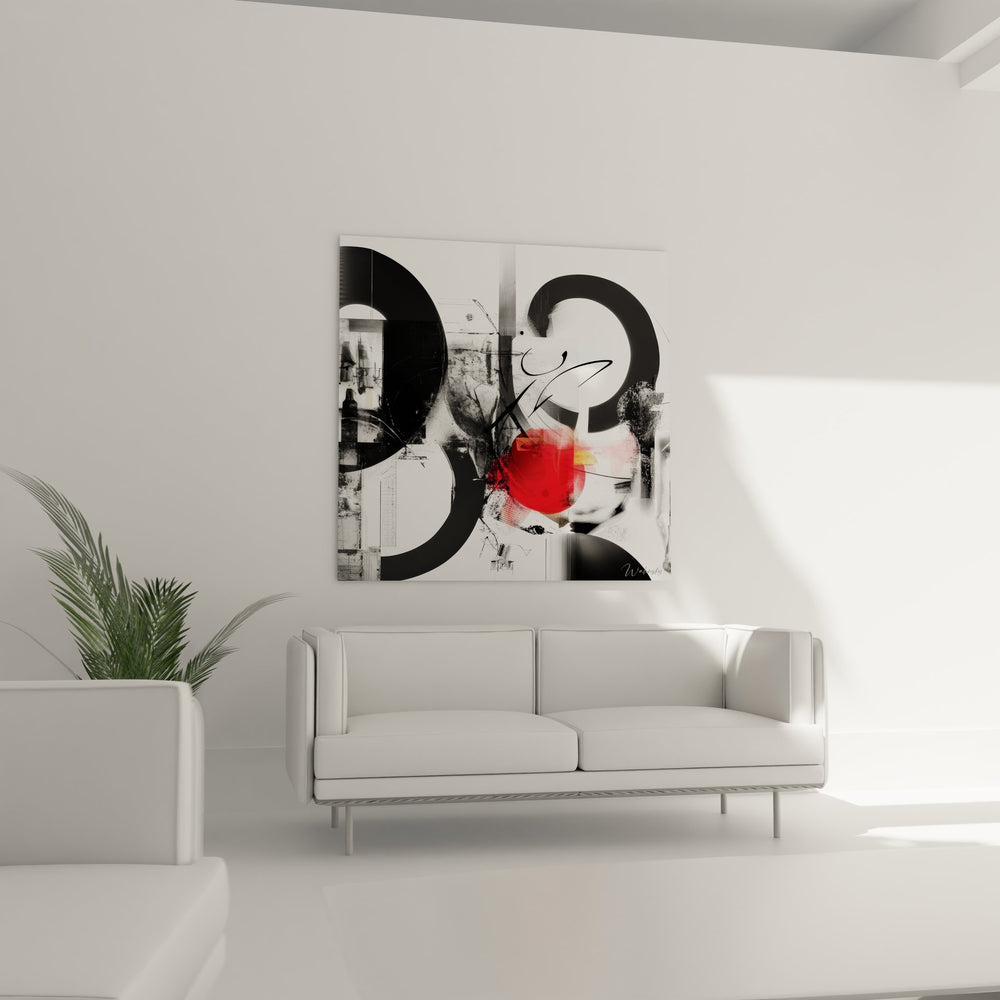La palette chromatique minimaliste de ce tableau repose sur un contraste saisissant entre le noir, le blanc et le rouge. Le rouge symbolise l'énergie, la passion et la vitalité, tandis que les formes noires géométriques représentent l'élégance et la sophistication. Cette harmonie colorielle crée un équilibre parfait entre dynamisme et raffinement, idéal pour une décoration murale moderne.