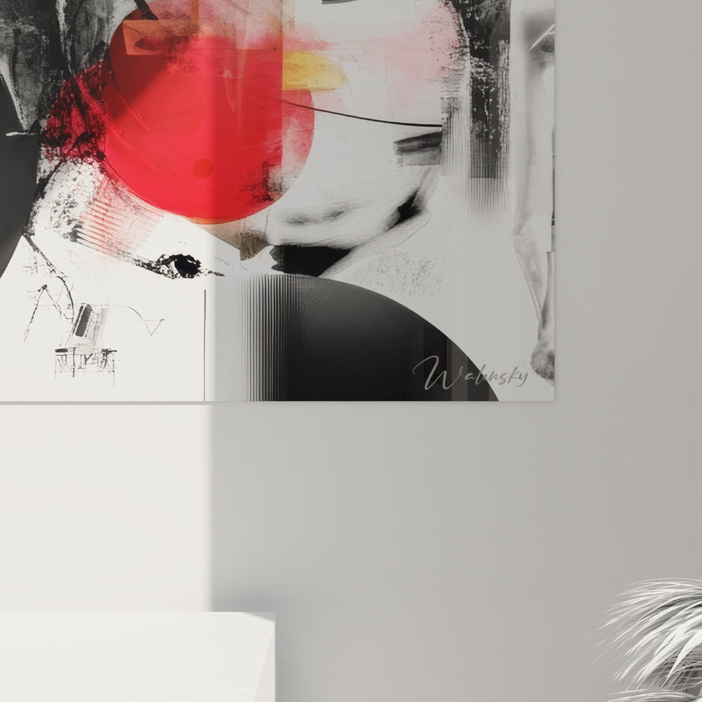 Ce tableau géométrique abstrait présente une composition dynamique où dominent les formes géométriques noires sur un fond blanc texturé. L'œuvre se caractérise par la présence de courbes élégantes et de lignes droites qui créent un dialogue visuel captivant. Au centre de la composition, un cercle rouge vibrant attire immédiatement le regard, servant de point focal à l'ensemble. Les éléments graphiques abstraits se superposent et s'entremêlent, créant une profondeur remarquable grâce aux jeux d'ombres et de transparences. Cette œuvre d'art contemporaine révèle également des détails subtils comme des fragments de textures, des traits fins et des éclaboussures qui enrichissent la lecture visuelle. Le tableau mural géométrique évoque le mouvement et la modernité, parfait pour une décoration intérieure contemporaine. La signature de l'artiste Walensky en bas à droite authentifie cette création unique qui transformera instantanément votre espace de vie.
