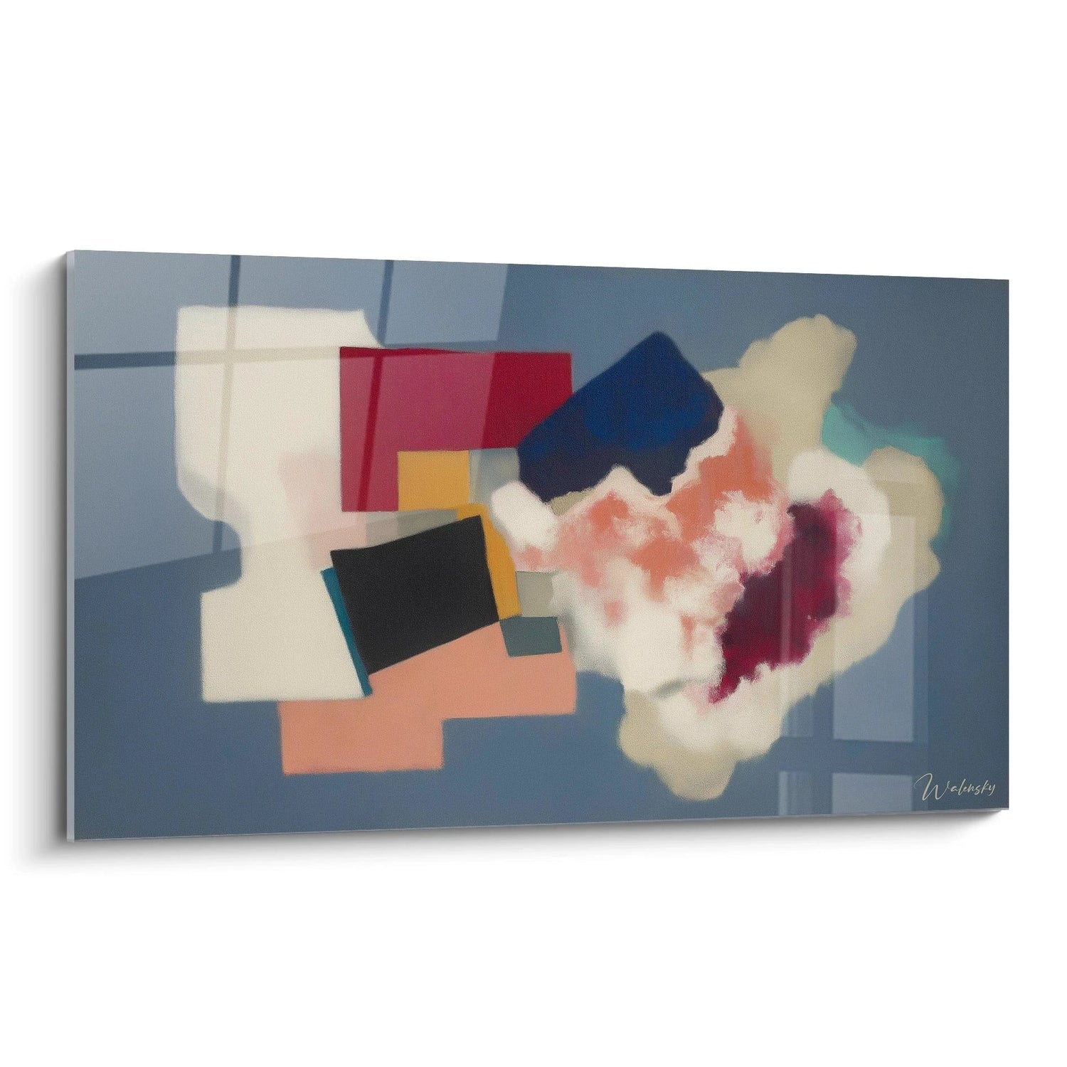 Ce tableau abstrait géométrique présente une composition fascinante où formes colorées et nuances vaporeuses s'entremêlent harmonieusement. L'œuvre révèle immédiatement sa nature dualiste : des rectangles aux couleurs franches côtoient des formes organiques aux contours flous. Le tableau abstrait géométrique moderne exprime une tension créative entre structure et liberté, entre précision mathématique et expression spontanée. Les formes géométriques - rectangles rouge, orange, noir et bleu marine - ancrent solidement la composition dans un univers architectural, tandis que les zones vaporeuses créent un dialogue poétique avec ces éléments rigides.