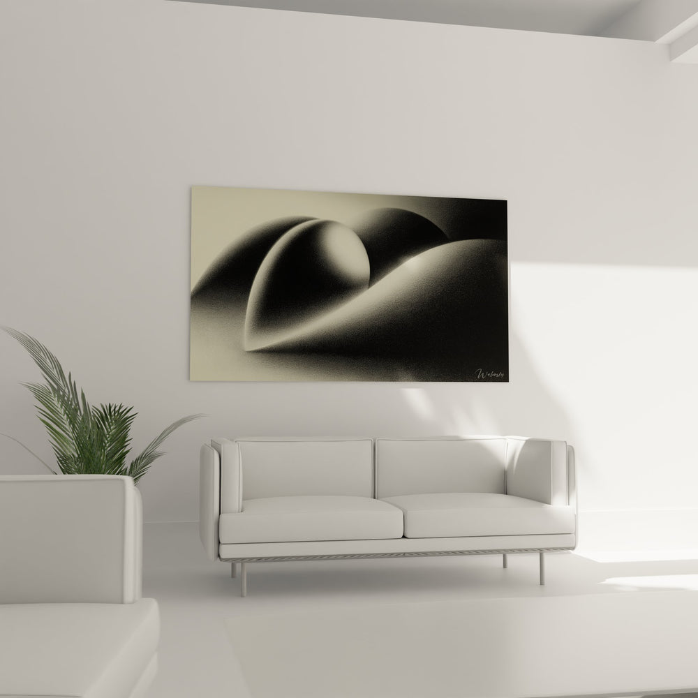 Ce tableau mural formes organiques présente une composition artistique d'une élégance remarquable, où les courbes sensuelles se déploient dans un jeu de lumière et d'ombre captivant. L'œuvre révèle des formes fluides abstraites qui évoquent la douceur et la sensualité à travers un traitement photographique raffiné. Les volumes sculptent l'espace avec une grâce naturelle, créant un art mural contemporain d'une grande sophistication. Cette décoration murale moderne transforme l'espace par sa présence apaisante et son esthétique épurée. Le tableau noir et blanc abstrait joue sur les contrastes subtils pour révéler chaque nuance des formes organiques. L'artiste maîtrise parfaitement l'art de la composition minimaliste, offrant une œuvre qui dialogue avec l'architecture intérieure. Ces courbes évoquent les mouvements naturels, rappelant les ondulations du sable ou les plis d'un tissu soyeux. La texture lisse et les dégradés créent une profondeur visuelle qui invite à la contemplation et à la rêverie.