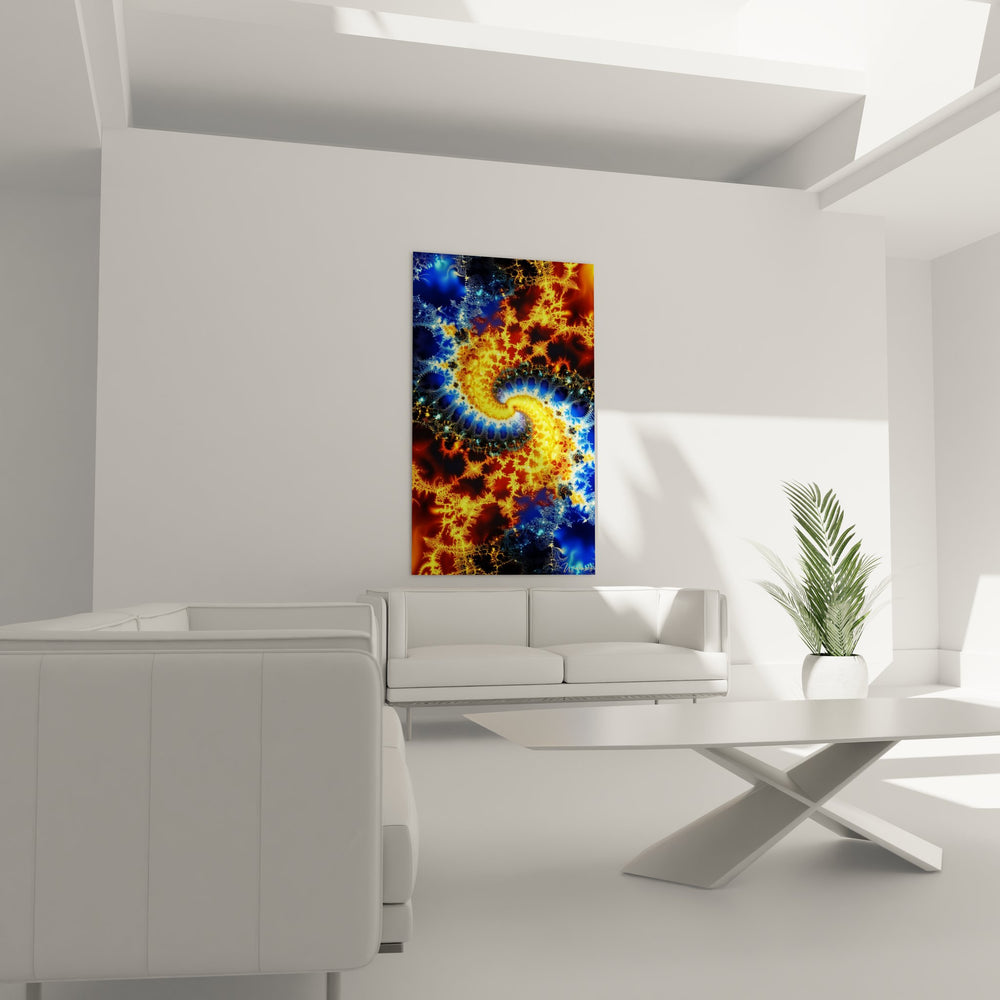 Ce tableau fractale cosmique présente une composition saisissante où s'entremêlent harmonieusement les forces opposées du feu et de la glace dans un ballet cosmique hypnotisant. L'œuvre révèle un art fractal contemporain d'une complexité remarquable, où les motifs mathématiques génèrent des formes organiques infiniment détaillées. Au centre de cette décoration murale fractale, une spirale dorée majestueuse évoque une galaxie en formation, entourée d'éclats bleus cristallins et d'explosions orangées incandescentes. Les formes géométriques fractales se déploient en cascade, créant une profondeur visuelle vertigineuse qui invite l'observateur dans un voyage interdimensionnel. Cette œuvre d'art numérique exploite la beauté des algorithmes mathématiques pour produire des textures d'une richesse exceptionnelle, où chaque détail révèle de nouveaux motifs à l'infini. Le tableau mural fractale transforme l'espace de vie en portail vers des dimensions parallèles, apportant une dimension mystique et scientifique à la fois. Les jeux de lumière intégrés dans la composition créent des effets de brillance qui évoquent la matière stellaire en fusion, tandis que les zones plus sombres ancrent l'ensemble dans une profondeur cosmique troublante.