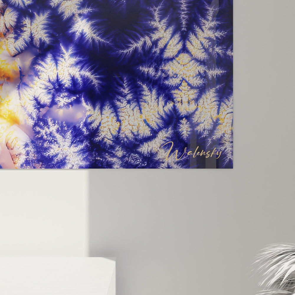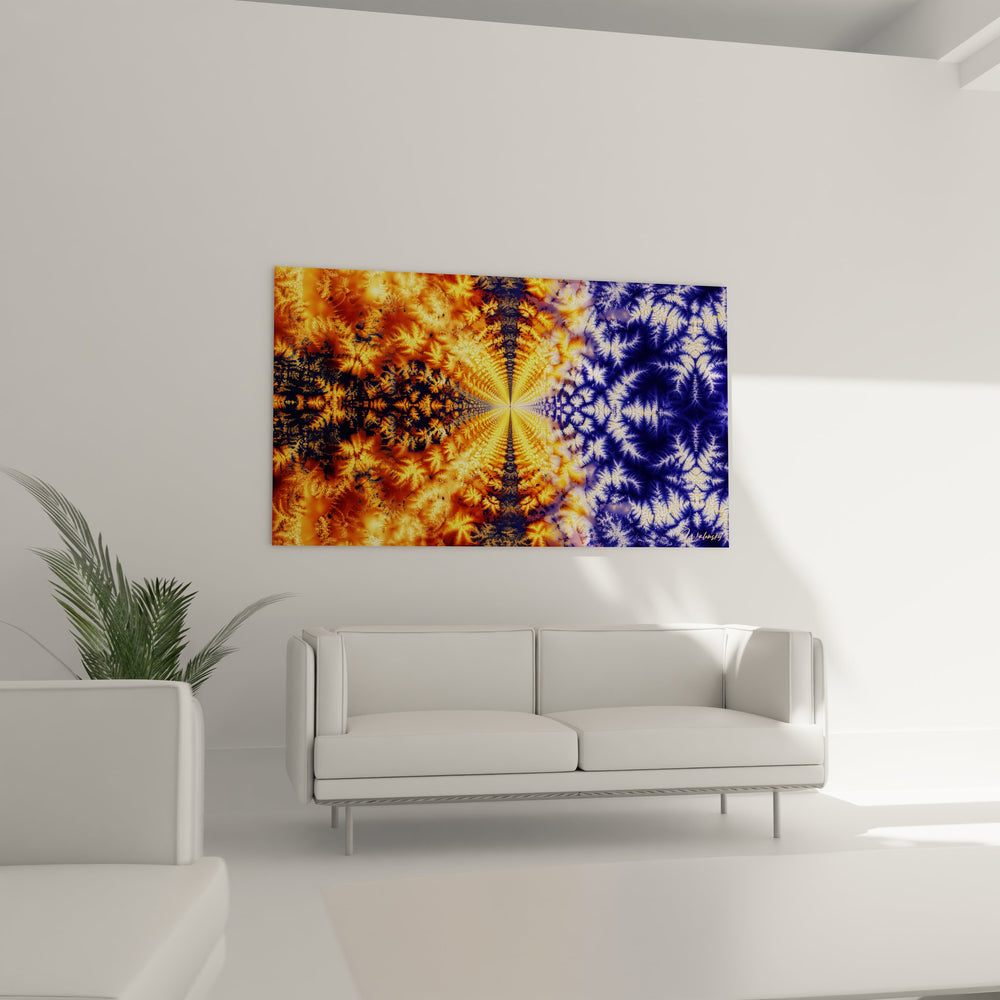 Ce magnifique tableau fractale présente une composition saisissante où s'affrontent deux univers chromatiques opposés dans une harmonie parfaite. La partie gauche de cette œuvre d'art numérique déploie des teintes dorées et orangées incandescentes, évoquant les flammes d'un brasier cosmique, tandis que la partie droite révèle des nuances bleu profond et violettes rappelant la froideur glaciale de l'espace intersidéral. Au centre de cette décoration murale moderne, une spirale hypnotique agit comme un vortex gravitationnel, créant un point de convergence entre ces deux forces antagonistes. Les motifs fractals géométriques se répètent à l'infini, formant des structures végétales stylisées qui évoquent des fougères cristallisées ou des coraux mathématiques. Cette art mural contemporain exploite la symétrie et l'asymétrie pour créer un équilibre visuel dynamique. Les détails microscopiques révèlent une complexité infinie, caractéristique de l'art fractal numérique, où chaque zoom dévoile de nouveaux patterns et textures. Cette toile décorative abstraite transforme l'espace de vie en galerie d'art moderne grâce à ses dimensions généreuses et son impact visuel saisissant.