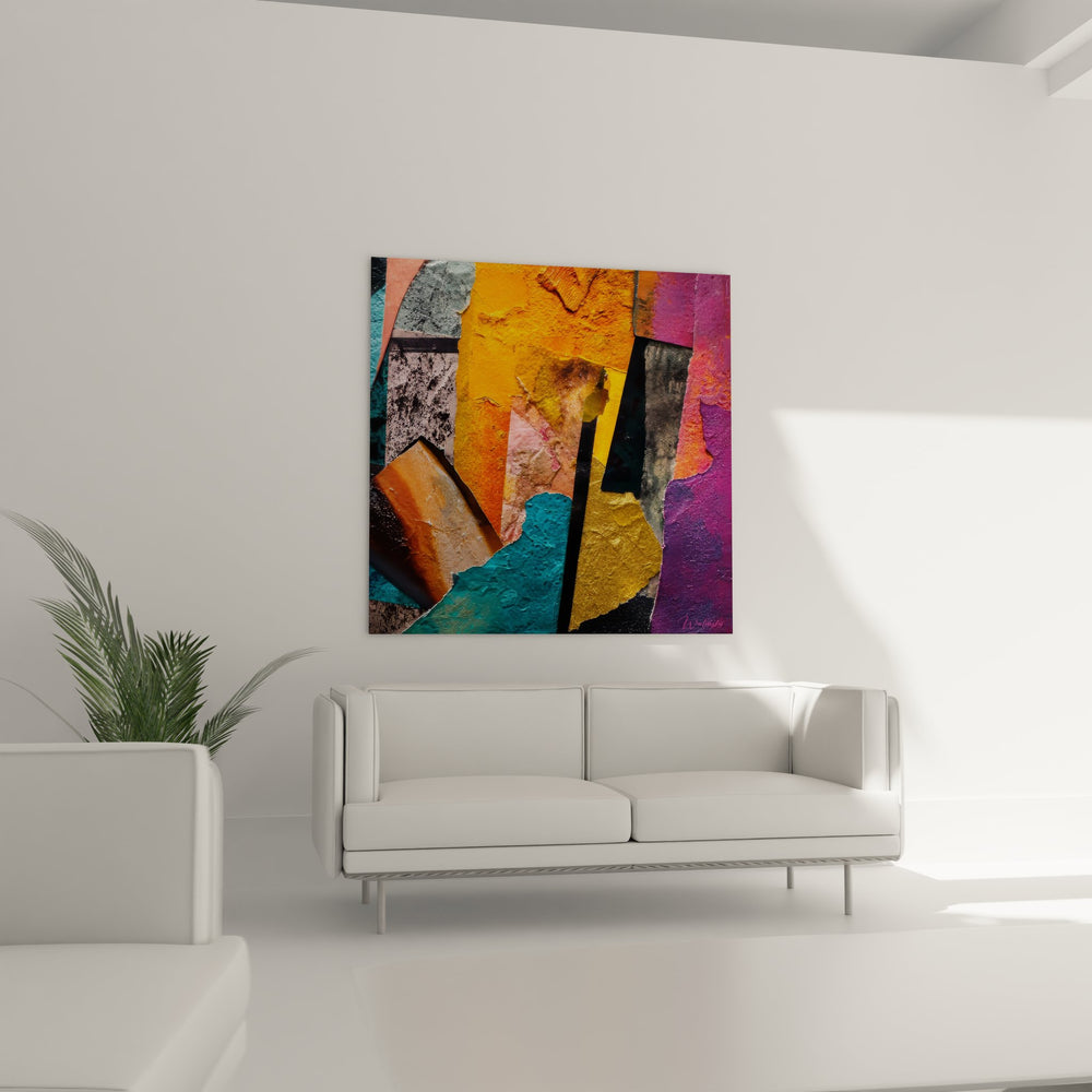 Cette œuvre d'art contemporain présente un tableau mural collage d'une complexité visuelle saisissante, composé de multiples fragments géométriques aux couleurs vives et contrastées. Les éléments se superposent et s'entremêlent dans une composition dynamique qui évoque les connexions neuronales du cerveau. Chaque fragment semble être découpé dans différents matériaux texturés, créant un relief tactile qui enrichit l'expérience visuelle. Les nuances d'orange éclatant dominent le centre de l'œuvre, tandis que des touches de bleu turquoise, de violet profond, de rose corail et de jaune doré créent un équilibre chromatique harmonieux. Cette œuvre d'art murale moderne révèle une technique de collage sophistiquée où les superpositions créent des jeux d'ombres et de lumières. Les formes angulaires et organiques cohabitent, rappelant l'architecture complexe du système nerveux. La texture rugueuse de certains fragments contraste avec la surface lisse d'autres éléments, offrant une richesse tactile qui invite à l'exploration visuelle. Ce tableau décoratif contemporain s'impose comme une pièce maîtresse capable de transformer n'importe quel espace de vie en galerie d'art personnelle.