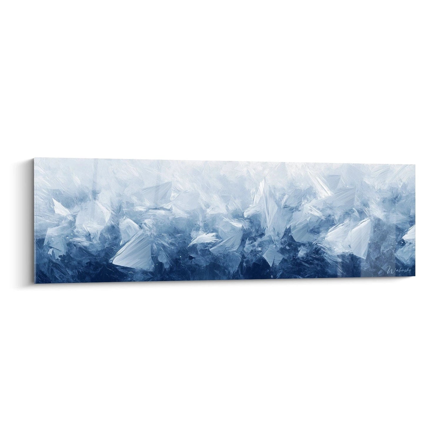 La composition de ce tableau abstrait bleu moderne repose sur un équilibre asymétrique savamment orchestré. Les éléments principaux s'articulent autour d'un axe diagonal invisible qui traverse l'œuvre de gauche à droite. Les formes angulaires et les surfaces planes créent un rythme visuel soutenu, guidant le regard dans une exploration constante. L'espace est divisé en zones d'intensité variable, alternant entre des passages denses et des respirations plus claires. Cette art mural abstrait bleu exploite parfaitement les proportions horizontales pour créer une sensation d'expansion et de mouvement. La perspective multidimensionnelle donne l'impression que certains éléments flottent au-dessus d'autres, créant une profondeur remarquable.