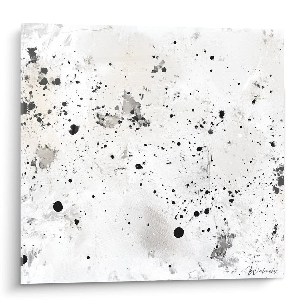 Ce tableau éclaboussures abstraites présente une composition monochrome fascinante où le noir, le blanc et les nuances de gris s'entremêlent dans une danse chaotique maîtrisée. Les projections d'encre créent un paysage visuel dynamique, évoquant simultanément l'univers cosmique et l'expression gestuelle pure. Cette décoration murale éclaboussures contemporaine capture l'essence de l'art action painting avec ses multiples points noirs de tailles variées dispersés sur fond blanc nacré. Les traces gestuelles et les coulures subtiles témoignent d'une technique spontanée où le hasard contrôlé devient l'outil principal de création. L'effet général produit une sensation de mouvement perpétuel, comme si l'œuvre continuait de vivre sous nos yeux.