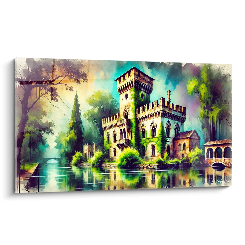 Ce tableau est bien plus qu’une simple représentation ; c’est un voyage visuel au cœur des campagnes françaises, où la pierre ancienne d’un château médiéval se reflète paisiblement dans une eau cristalline. Le vert luxuriant des feuillages, la lumière douce qui filtre à travers les arbres, tout concourt à créer une ambiance à la fois mystérieuse et sereine.