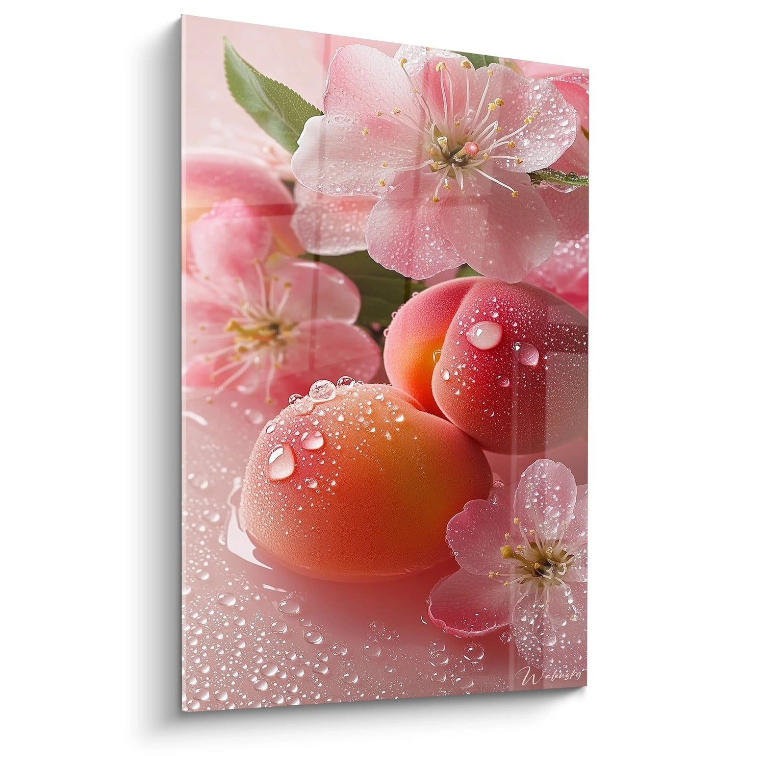 Chaque détail de ce tableau est soigneusement travaillé pour éveiller vos sens : la texture veloutée des pêches, la pureté des gouttes d’eau immobiles, le rose délicat des fleurs de cerisier qui semblent palpiter de vie. Vous pouvez presque sentir la fraîcheur humide, la douceur fragile d’un instant suspendu entre rêve et réalité. Cette harmonie visuelle crée une atmosphère apaisante et raffinée, parfaite pour sublimer les espaces consacrés aux plaisirs culinaires et à la convivialité.