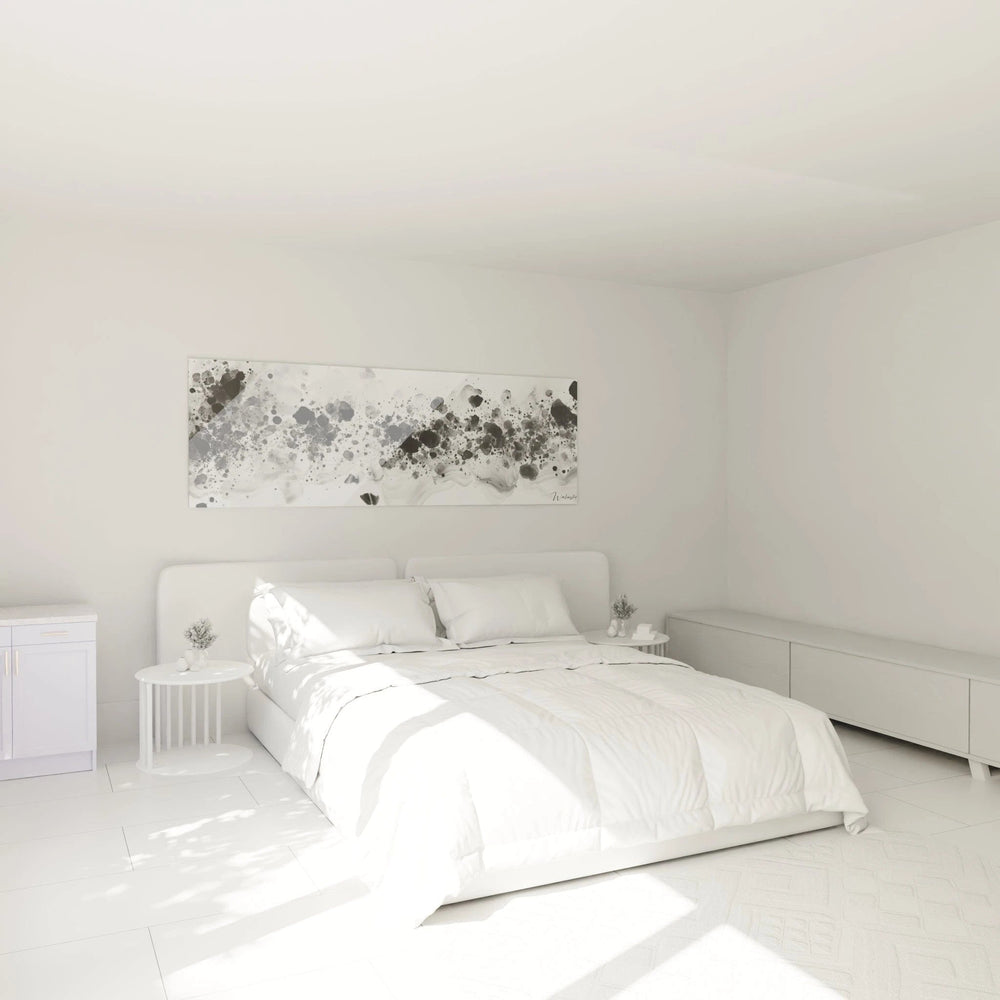 Ce tableau abstrait panoramique s'épanouit dans des espaces contemporains aux murs clairs où il peut déployer toute sa force visuelle. Un éclairage dirigé révèle les reliefs subtils des éclaboussures, tandis qu'un éclairage diffus préserve l'harmonie de l'ensemble. Cette décoration murale abstraite élégante s'harmonise parfaitement avec :