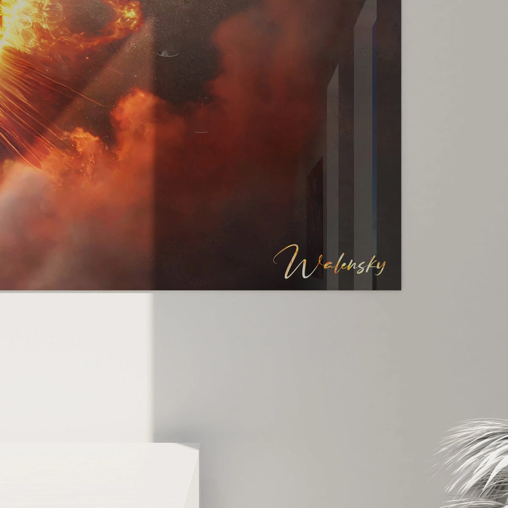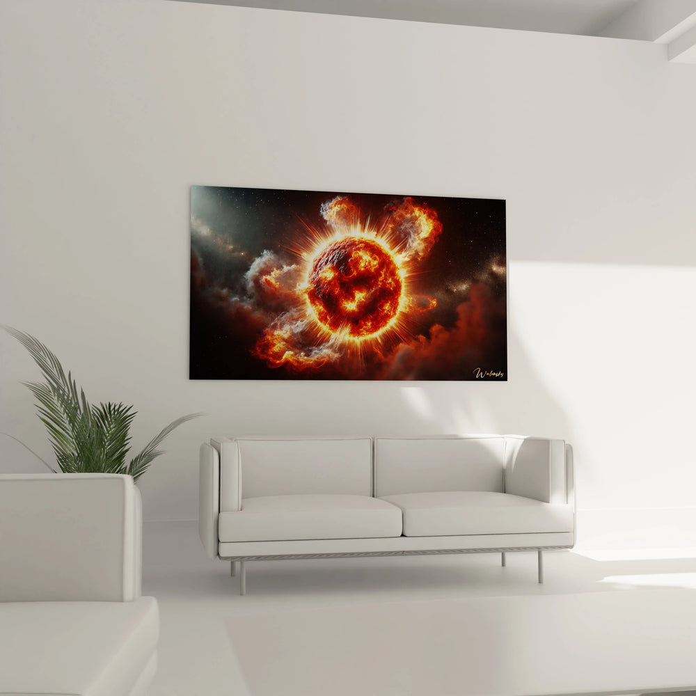 Chaque regard posé sur ce tableau vous transporte au cœur d’une éruption solaire. Les flamboiements intenses, les jeux de textures magnifiquement superposées qui rappellent la surface incandescente du Soleil, éveillent un spectacle hypnotique où la lumière danse avec la matière. C’est une célébration de la vitalité pure, de la régénération et de la lumière qui réchauffe non seulement votre pièce, mais aussi l’âme.