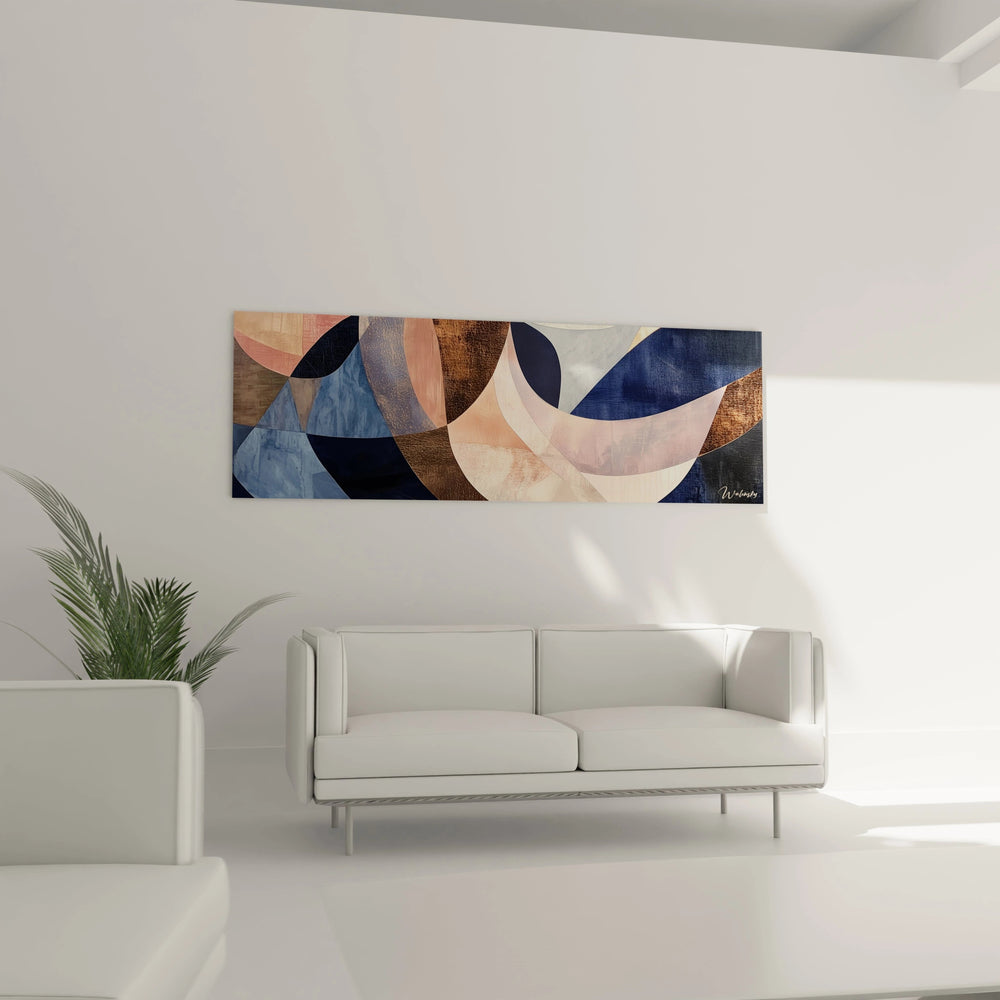 La composition s'organise autour d'un équilibre dynamique où les formes courbes créent un mouvement horizontal harmonieux. Le tableau géométrique abstrait horizontal utilise intelligemment l'espace panoramique pour développer un rythme visuel captivant. Les lignes directrices suivent des trajectoires organiques qui guident naturellement l'œil de gauche à droite. La perspective adoptée crée une profondeur subtile grâce aux superpositions calculées des différents éléments. Les proportions respectent un équilibre parfait entre les zones de densité visuelle et les espaces de respiration, conférant à cette œuvre géométrique murale une harmonie architecturale remarquable.