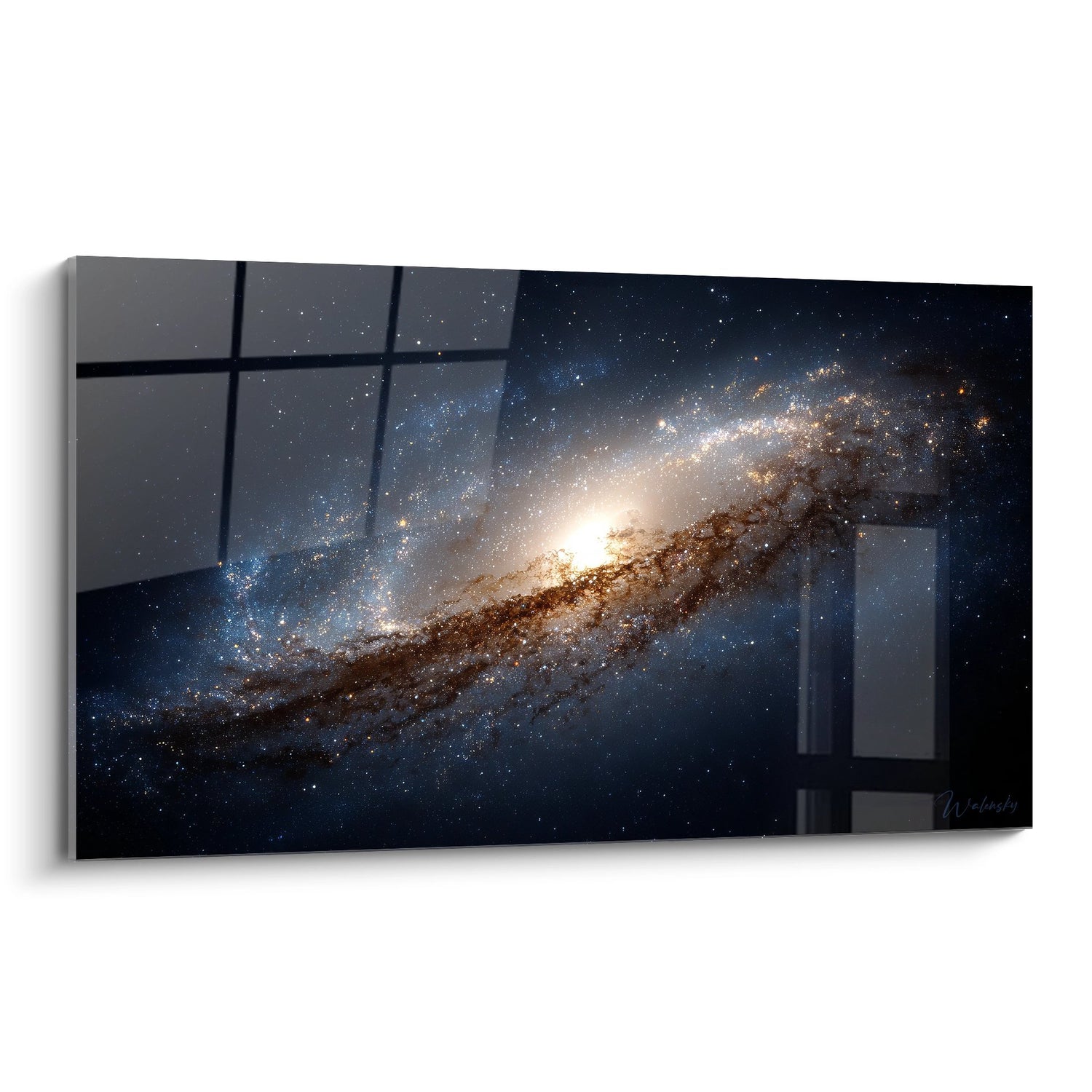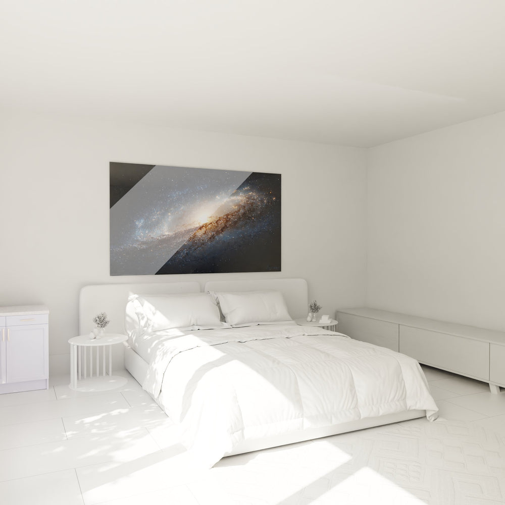Ce tableau mural galaxie présente une représentation saisissante d'une galaxie spirale aux dimensions cosmiques impressionnantes. L'œuvre capture la majesté de l'univers à travers une composition dynamique où les bras spiralés de la galaxie s'étendent dans l'immensité de l'espace. Le cœur lumineux de la galaxie rayonne d'une lumière dorée intense, créant un contraste dramatique avec les régions périphériques plus sombres. Cette décoration murale astronomique révèle les détails fascinants de la structure galactique, avec ses millions d'étoiles formant des traînées lumineuses caractéristiques. Le tableau art spatial offre une perspective unique sur notre univers, invitant à la contemplation et à l'émerveillement. Les nuages de gaz et de poussière cosmique sont rendus avec une précision remarquable, créant des zones d'ombre et de lumière qui donnent une profondeur extraordinaire à l'ensemble. Cette œuvre d'art galaxie transforme n'importe quel espace en fenêtre sur l'infini, apportant une dimension spirituelle et scientifique à votre intérieur. La composition équilibrée entre les éléments lumineux et sombres crée un rythme visuel captivant qui ne cesse de fasciner les observateurs.