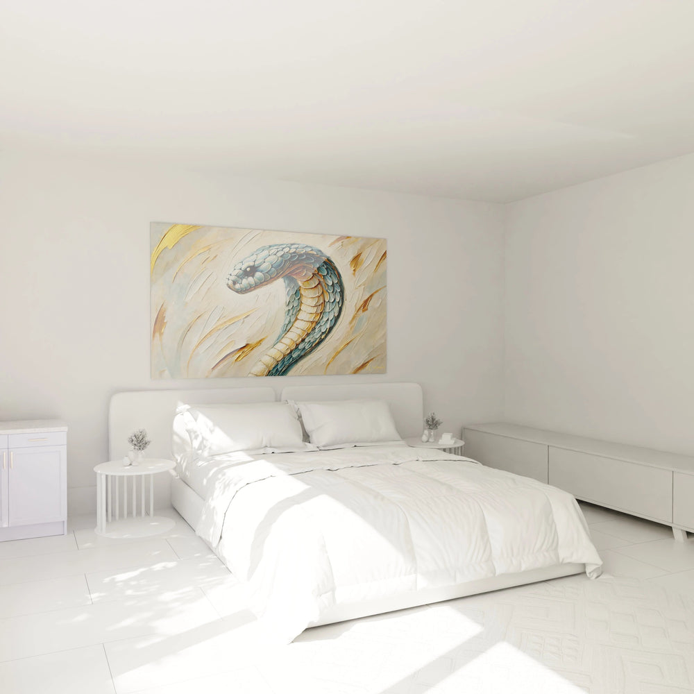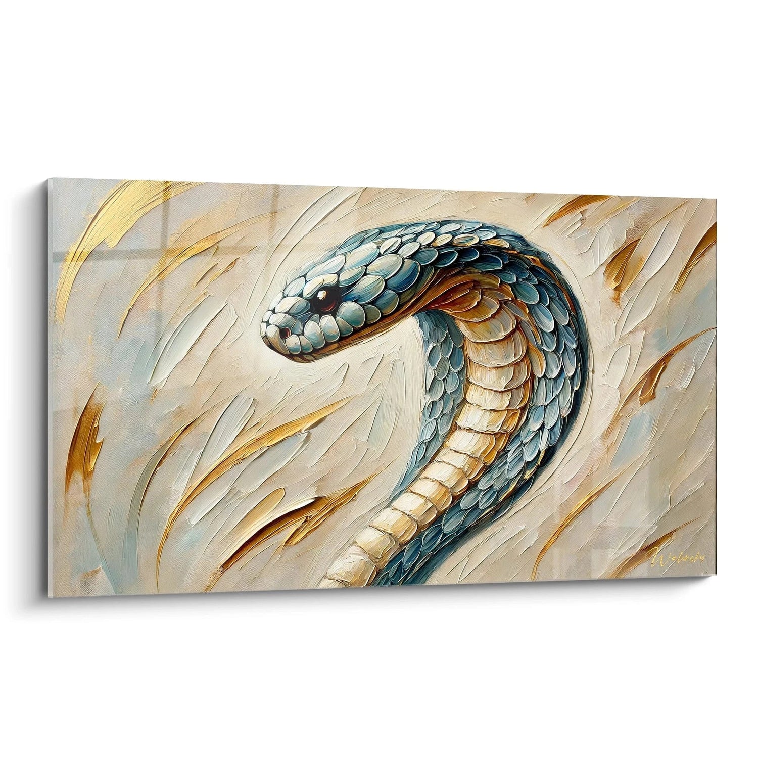 Imaginez ce serpent, dont chaque écaille dorée renvoie la lumière avec éclat, serpentant entre des nuances de bleu profond et de beige subtil. Ce contraste chromatique évoque à la fois le mystère enveloppant le reptile et la noblesse intrinsèque de son essence. En le découvrant, vous ressentirez une vibration à la fois puissante et apaisante, une énergie protectrice qui vous invite à un voyage intérieur et à une métamorphose personnelle.
