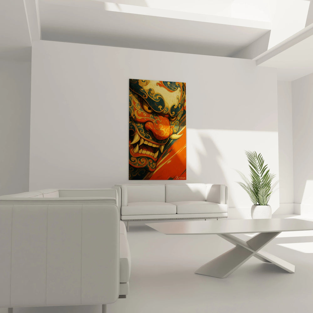 Inspiré des masques rituels des théâtres nô et kabuki, ce tableau fait revivre les gardiens spirituels aux expressions sauvages et vibrantes. Le visage menaçant, aux yeux perçants et aux crocs acérés, dégage une force à la fois intimidante et fascinante. Vous ressentez presque la présence invisible de ces esprits, protecteurs des légendes millénaires, qui veillent silencieusement sur votre espace.