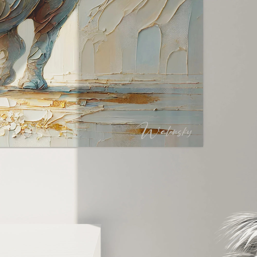 Ce tableau sublime la silhouette imposante du rhinocĂ©ros par un jeu subtil de textures rappelant la pierre naturelle, presque sculpturale. Vous ressentirez sous vos doigts lâĂ©paisseur protectrice de sa peau, tandis que les nuances dĂ©licates de beige, blanc et or illuminent son environnement vĂ©gĂ©tal finement esquissĂ©. Cette combinaison invite Ă un apaisement profond â un moment de calme oĂč la majestĂ© brute rencontre la finesse de la vie sauvage.