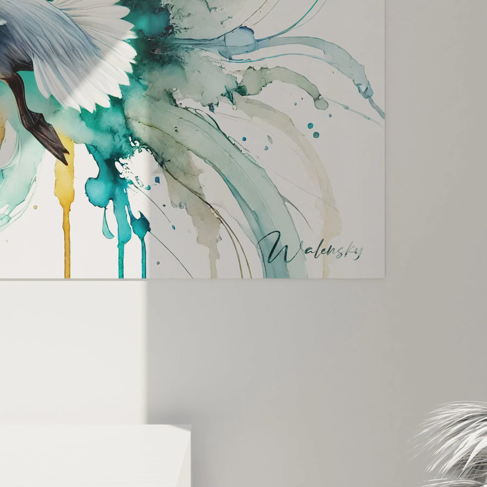 Ce tableau évoque la danse aérienne du pélican’s ailes déployées, sur fond de courants fluides où se mêlent les nuances de bleu, d’orange et de blanc. Ces couleurs, délicatement choisies, évoquent la fraîcheur de l’air marin et la chaleur dorée du soleil levant. Vous ressentirez, au premier regard, cette sensation apaisante d’un instant suspendu, où tout semble possible. La fluidité des formes invite votre esprit à s’évader, à s’abandonner au mouvement perpétuel des vagues et du vent.