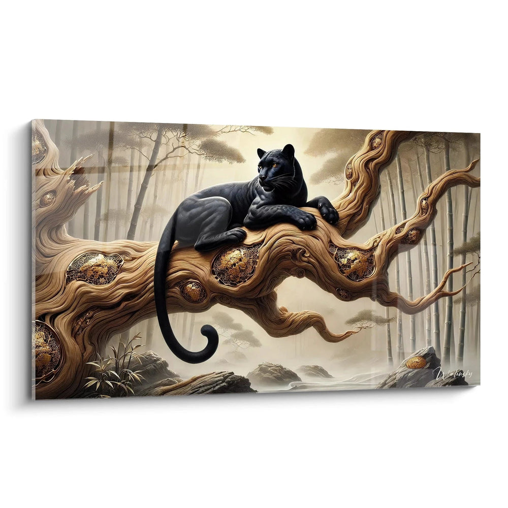 Plus qu’une simple image, ce tableau est une invitation immersive où chaque détail devient source d’émerveillement. La panthère, silhouette noire aux lignes impeccables, contraste magnifiquement avec la chaleur subtile de l’écorce, illuminée de touches d’or finement intégrées. Cette alliance de noir profond, d’or lumineux et de beige doux crée une harmonie visuelle qui apaise les sens tout en captivant les regards. Vous sentirez presque la texture rugueuse de l’arbre sous vos doigts et la douceur feutrée du pelage, une expérience visuelle et émotionnelle unique.