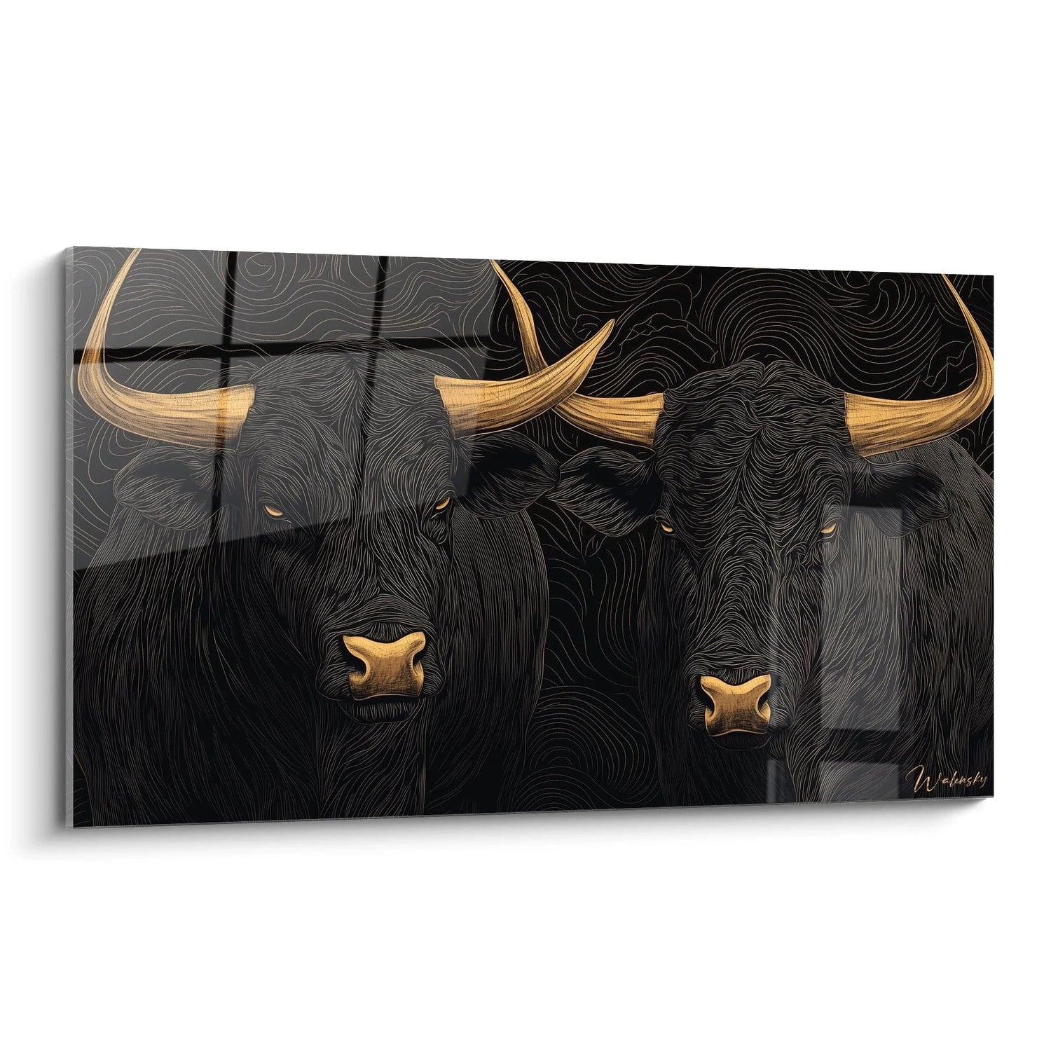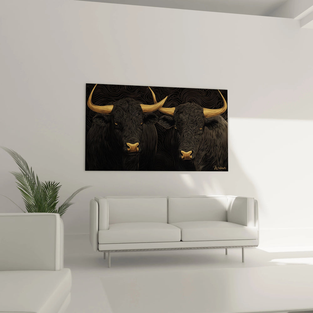 La composition de ce tableau taureau noir et or repose sur un équilibre parfait entre les deux figures bovines. Placés légèrement décalés et se faisant face, les taureaux occupent l'espace central de l'œuvre avec une présence imposante. Les lignes directrices sont principalement horizontales, créées par l'alignement des museaux et des yeux, contrebalancées par les courbes dynamiques des cornes qui s'élèvent vers le haut du cadre.