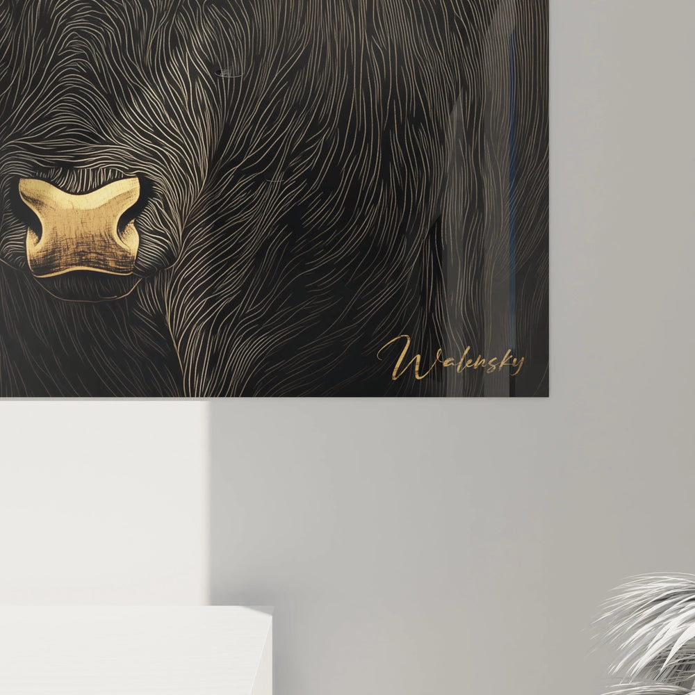 Les effets de lumière sont remarquablement maîtrisés dans ce tableau taureau noir majestueux, particulièrement dans le traitement des yeux ambrés qui semblent luire de l'intérieur et des reflets sur les cornes dorées. La technique artistique suggère une approche mixte combinant dessin linéaire précis et applications métallisées, créant des contrastes saisissants entre matiérés mates et surfaces réfléchissantes qui dynamisent l'ensemble de la composition.
