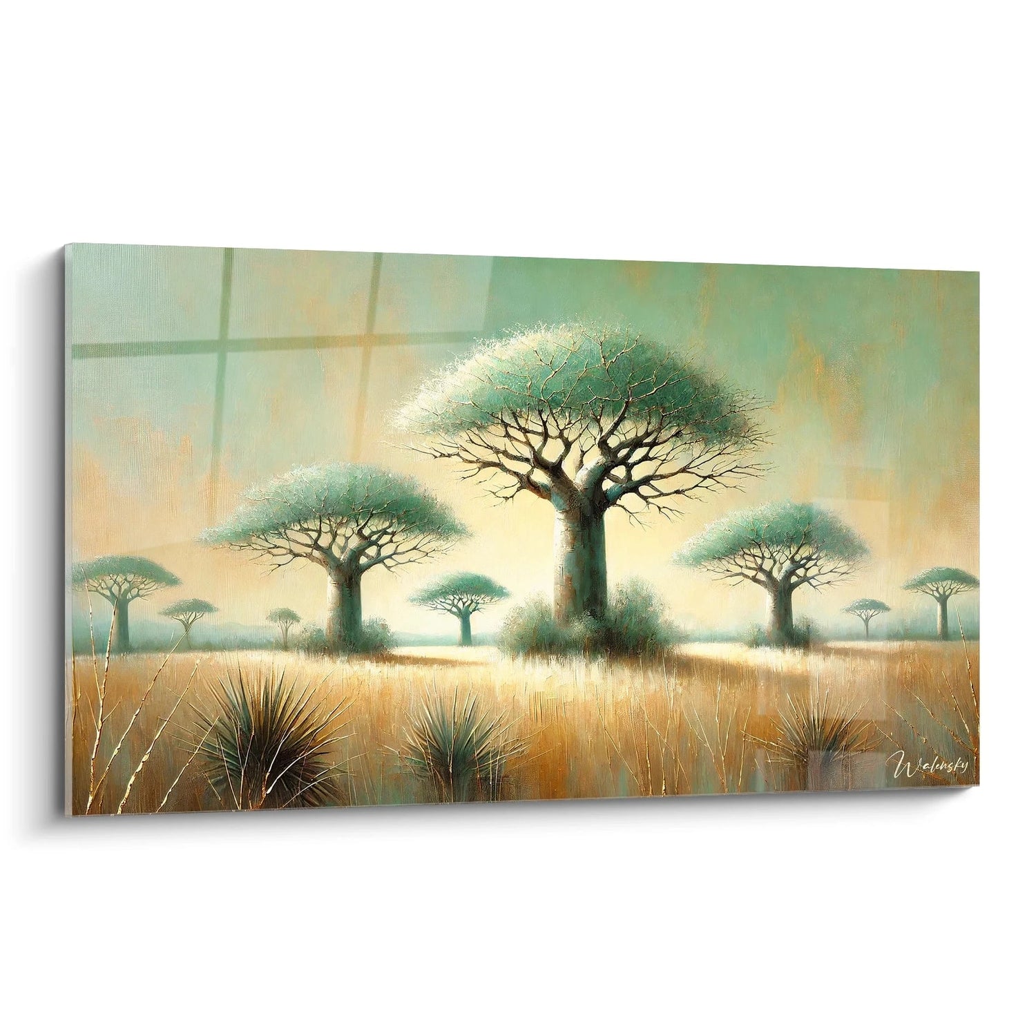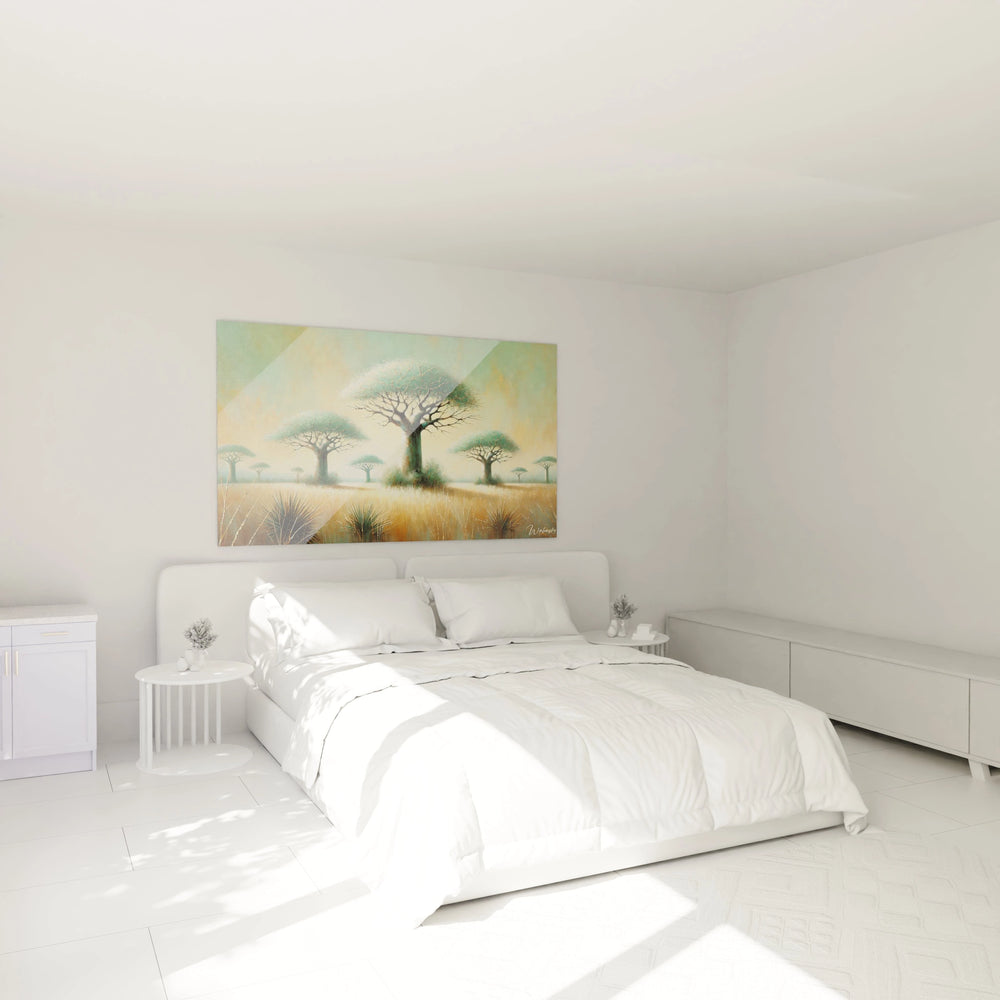Inspiré par les voyages à travers les vastes plaines africaines, ce tableau rend hommage à ces arbres mystiques, véritables gardiens du désert. Il n’est pas seulement une œuvre décorative, mais une invitation à ralentir, à savourer la beauté brute et à se reconnecter aux essentiels, dans la quiétude d’une scène qui semble figée dans le temps.